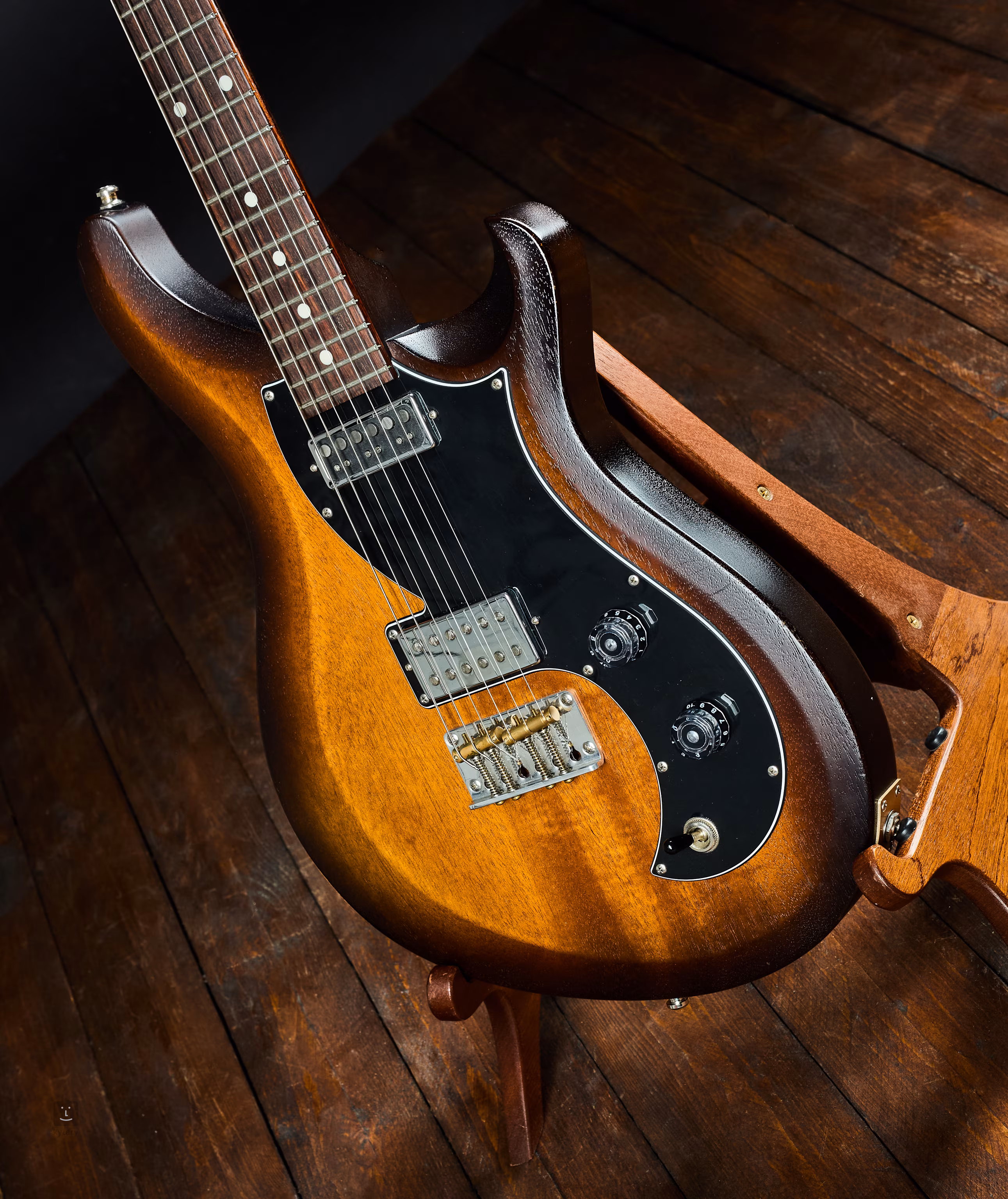 Der Korpus der Gitarre ist aus massivem Mahagoni gefertigt. Auf den Mahagoni-Hals mit Pattern Regular Profil ist ein Palisander-Griffbrett mit zweiundzwanzig Bünden geklebt. Positionspunkte erleichtern das Navigieren auf der Oberfläche. Die Kombination aus dem firmeneigenen Vela (Starla) Humbucker an der Stegposition und einem PRS Type-D Single-Coil-Pickup verleiht der Gitarre einen sehr hellen und druckvollen Ton, der sowohl mit der Maschine selbst als auch mit Ihren Lieblingseffekten hervorragend klingt. Der Klangcharakter kann mit dem Volume-Potentiometer, der Tonblende und dem Pickup-Schalter mit drei Positionen eingestellt werden. Mit der Push/Pull-Tonblende-Funktion können Sie die Humbucker-Spulen für einen reinen Single-Coil-Sound abnehmen.
