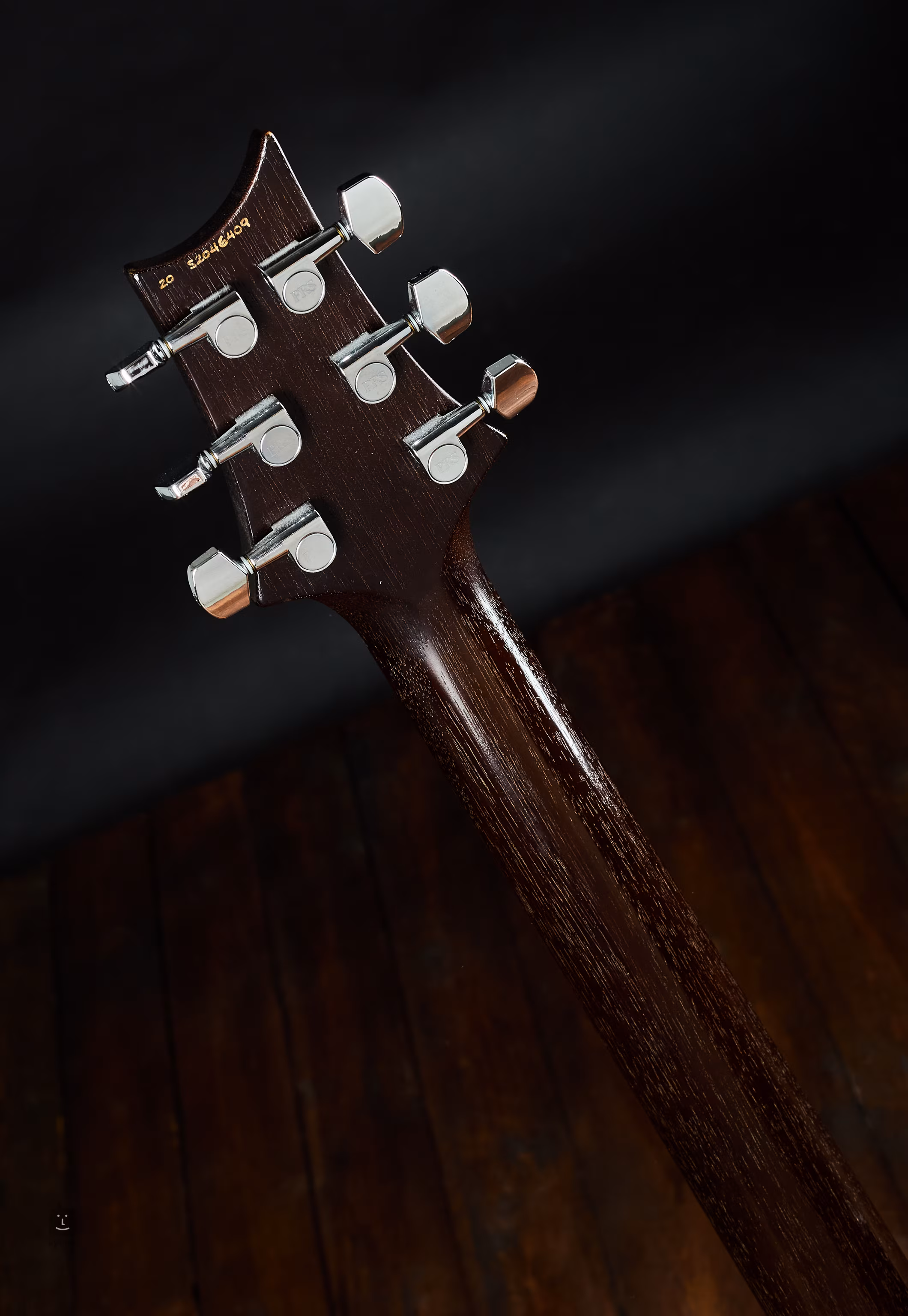 Die Stimmstabilität wird durch den festen Sitz der Saiten in der PRS Plate Style Kopfplatte und die arretierbaren Stimmmechaniken gewährleistet, die ungewollte Saitenbewegungen verhindern.
