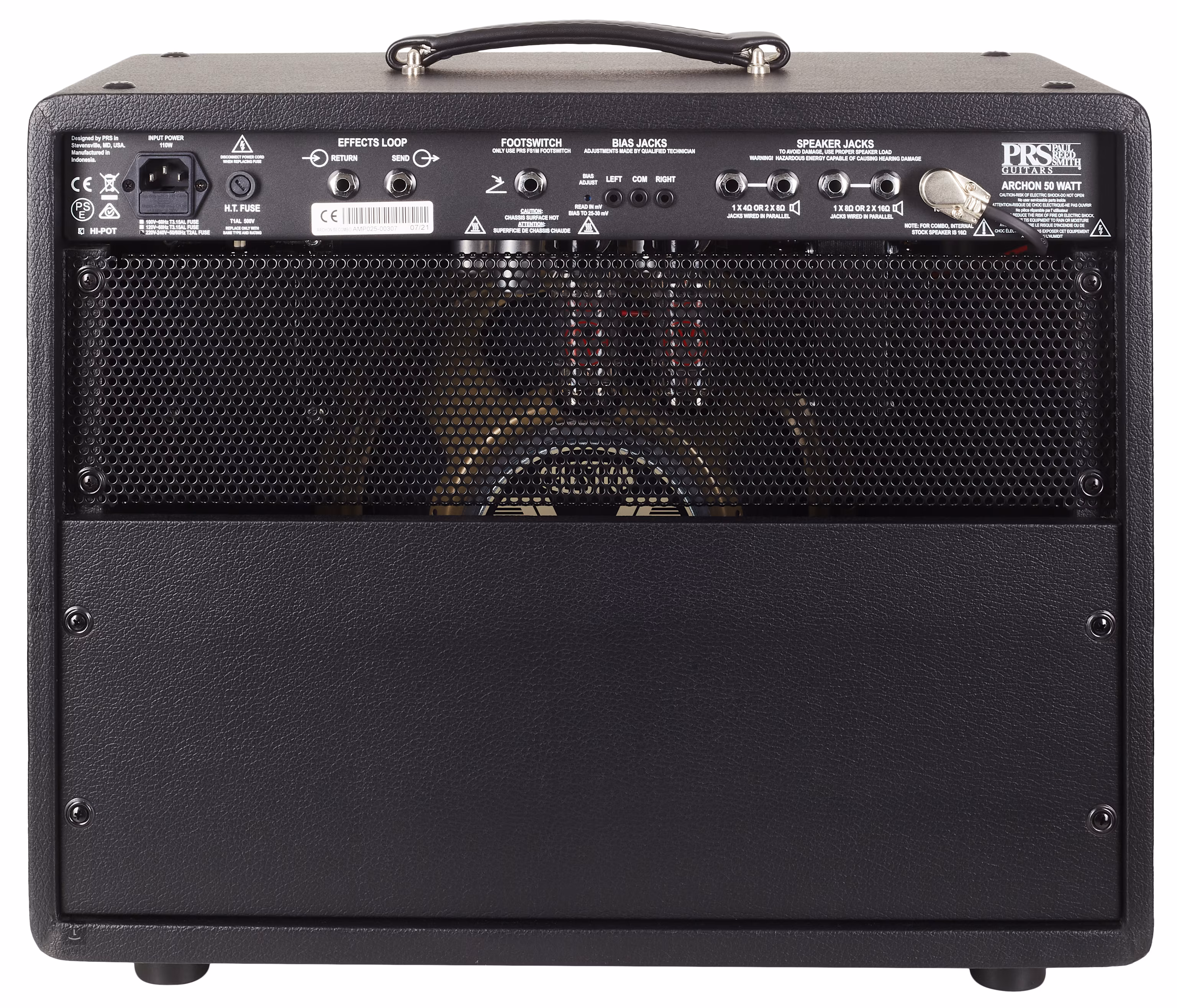 Auf der Rückseite befinden sich ein röhrengetriebener serieller Effektweg für die einfache Integration von Pedaleffekten, Ausgänge für externe Lautsprecher (1x 4, 2x 8, 1x 8, 2x 16 Ohm) und ein Eingang für den mitgelieferten Ein-Tasten-Fußschalter, der zum Umschalten zwischen den Kanälen dient. Das Herzstück der Box ist ein 12-Zoll Celestion V-Type Speaker.