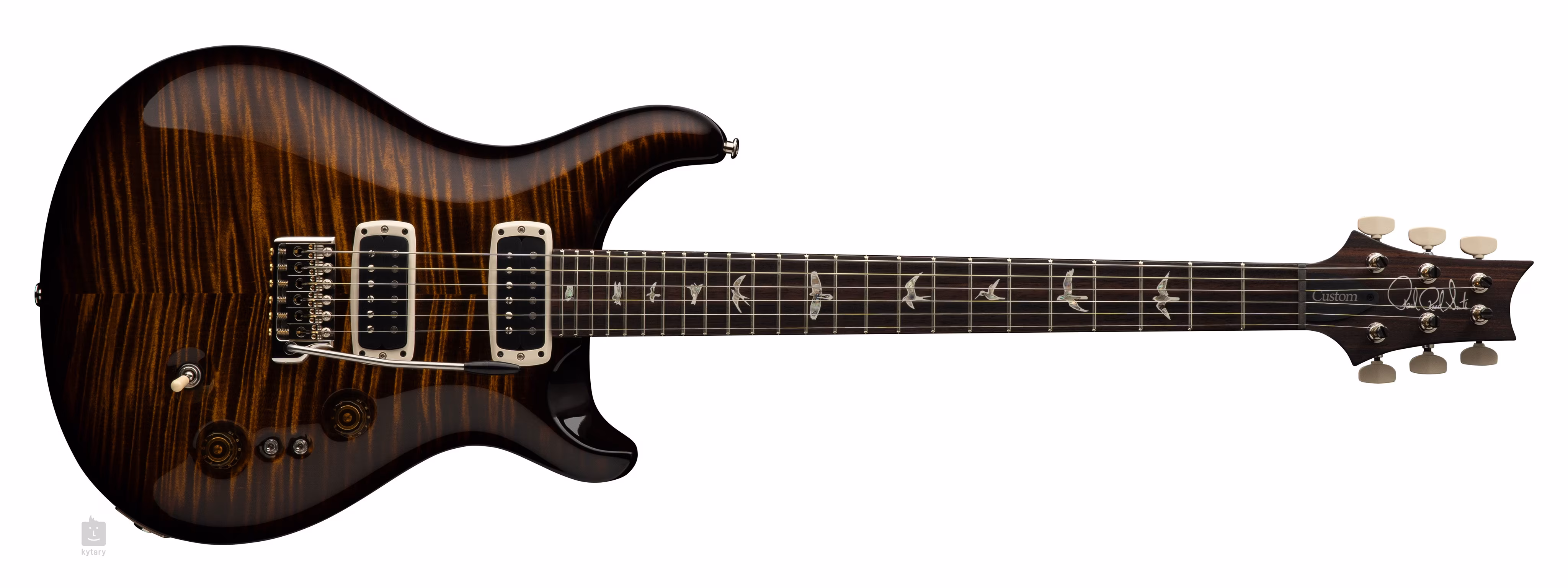 Die Custom 24-08 Black Gold Wraparound Burst besticht auf den ersten Blick durch die Kombination eines ergonomisch geformten Mahagoni-Korpus mit dem PRS-typischen Double Cutaway und einer gemaserten Ahorndecke mit cooler Holzmaserung. Ein einteiliger Mahagoni-Hals mit Pattern Thin-Profil ist mit einem Palisander-Griffbrett mit vierundzwanzig Bünden verleimt. Die Orientierung auf dem Griffbrett wird durch die PRS-typischen Positionsmarkierungen in Form von perlmuttfarbenen Vogelsilhouetten erleichtert.