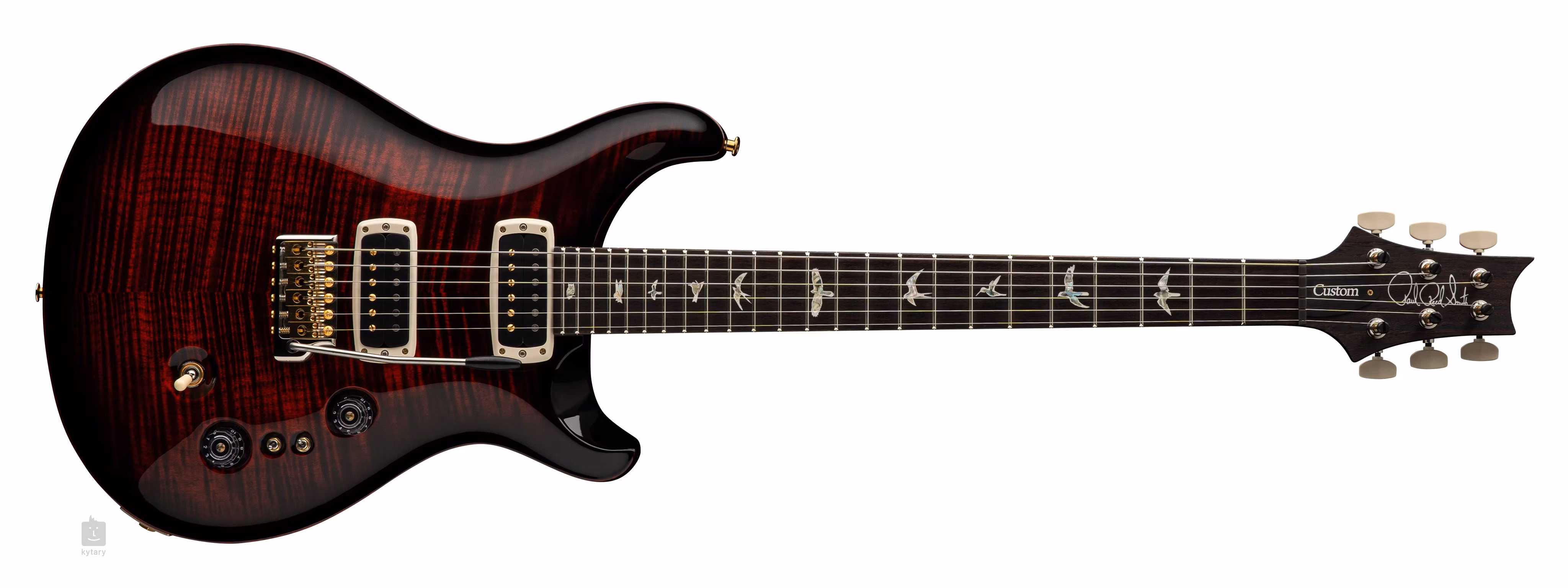 Das Modell Custom 24-08 Fire Smokeburst besticht auf den ersten Blick durch die Kombination eines ergonomisch geformten Mahagoni-Korpus mit dem typischen PRS-Double-Cutaway und einer gemaserten Ahorndecke mit cooler Holzmaserung. Ein einteiliger Mahagoni-Hals mit Pattern Thin-Profil ist mit einem Palisander-Griffbrett mit vierundzwanzig Bünden verleimt. Die Orientierung auf dem Griffbrett wird durch die PRS-typischen Positionsmarkierungen in Form von perlmuttfarbenen Vogelsilhouetten erleichtert.