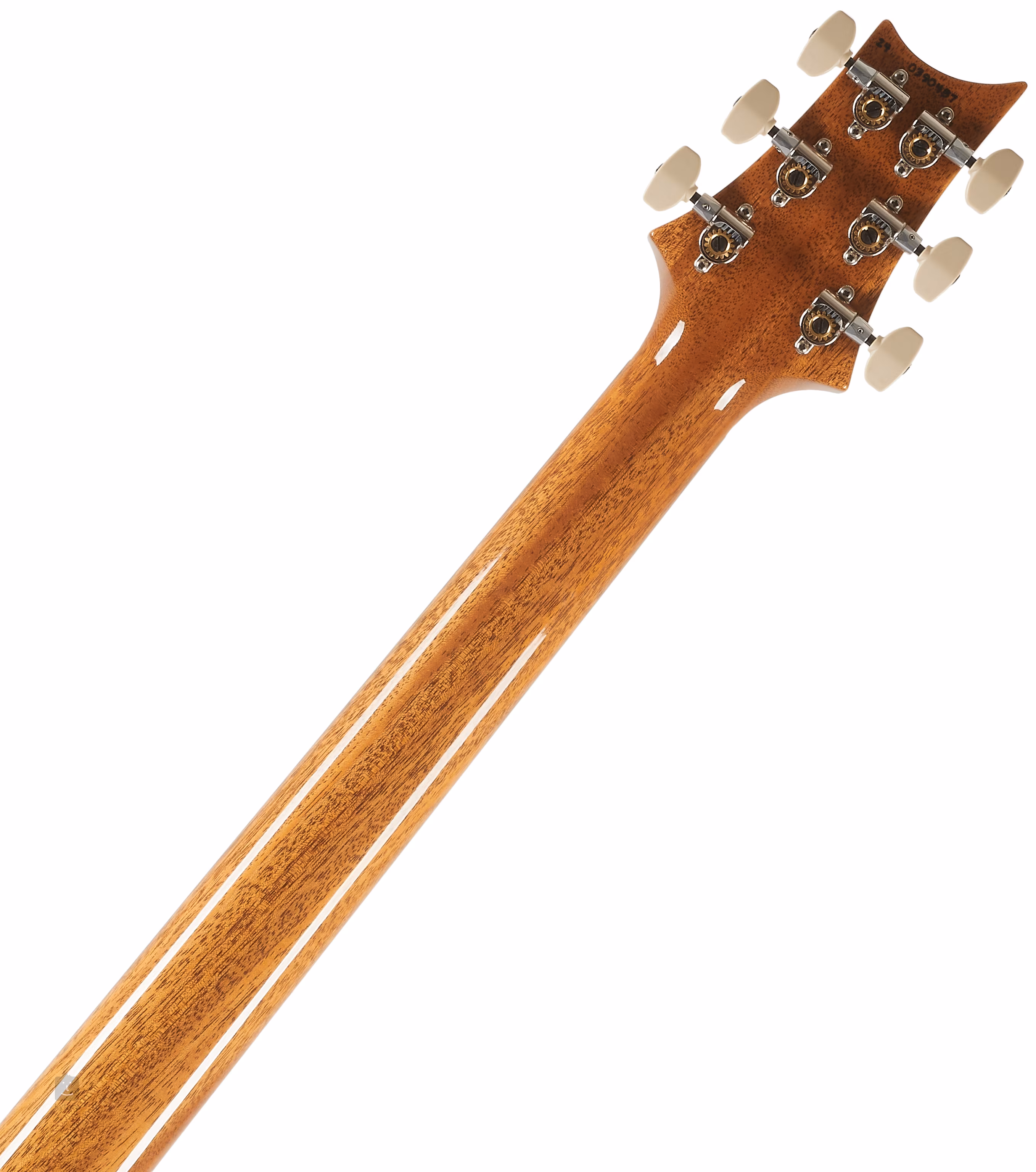 Das Modell Custom 24 Charcoal besticht auf den ersten Blick durch die Kombination eines ergonomisch geformten Mahagoni-Korpus mit dem typischen PRS-Double-Cutaway und einer gemaserten Ahorndecke mit kühler Holzmaserung. Ein einteiliger Mahagoni-Hals mit Pattern Thin-Profil ist mit einem Palisander-Griffbrett mit vierundzwanzig Bünden verleimt. Die Orientierung auf dem Griffbrett wird durch die PRS-typischen Positionsmarkierungen in Form von perlmuttfarbenen Vogelsilhouetten erleichtert.