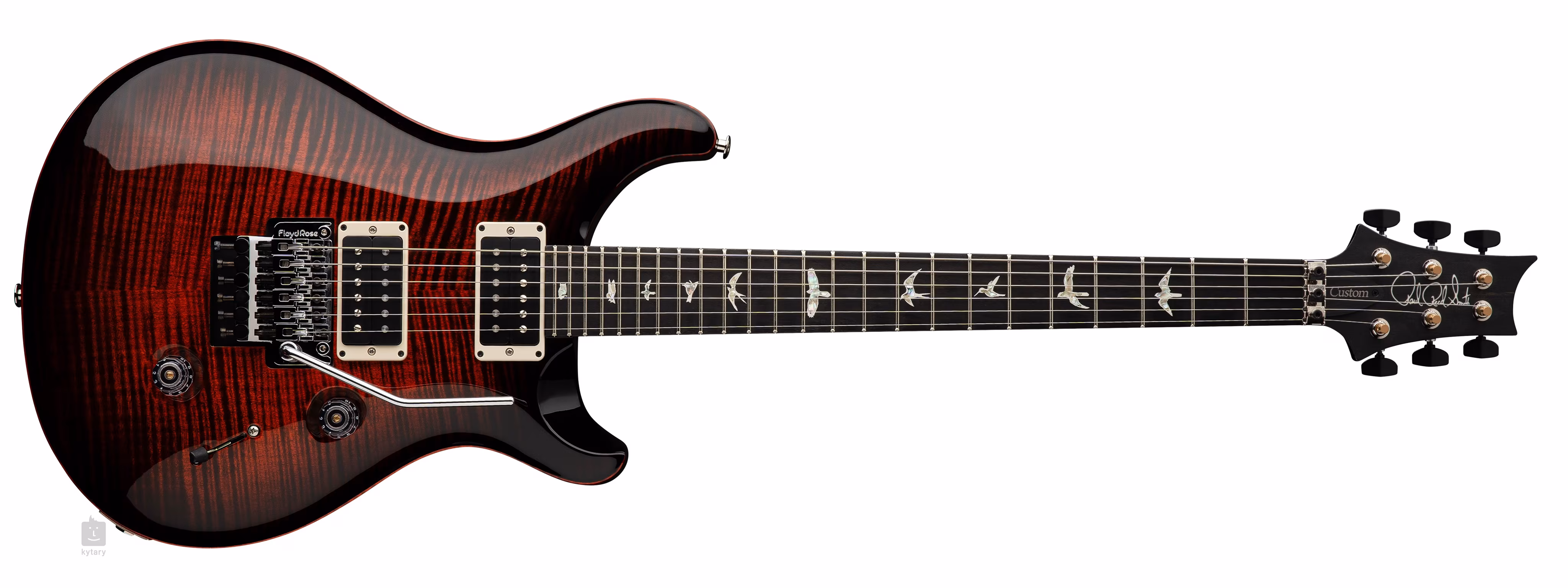 Die Custom 24 "Floyd" Fire Smokeburst besticht auf den ersten Blick durch die Kombination eines ergonomisch geformten Mahagoni-Korpus mit dem PRS-typischen Doppel-Cutaway und einer gemaserten Ahorndecke mit cooler Holzmaserung. Ein einteiliger Ahornhals mit Pattern Thin Profil wird durch ein Ebenholzgriffbrett mit vierundzwanzig Bünden ergänzt. Die Orientierung auf dem Griffbrett wird durch die charakteristischen PRS-Positionsmarker in Form von perlmuttfarbenen Vogelsilhouetten erleichtert.