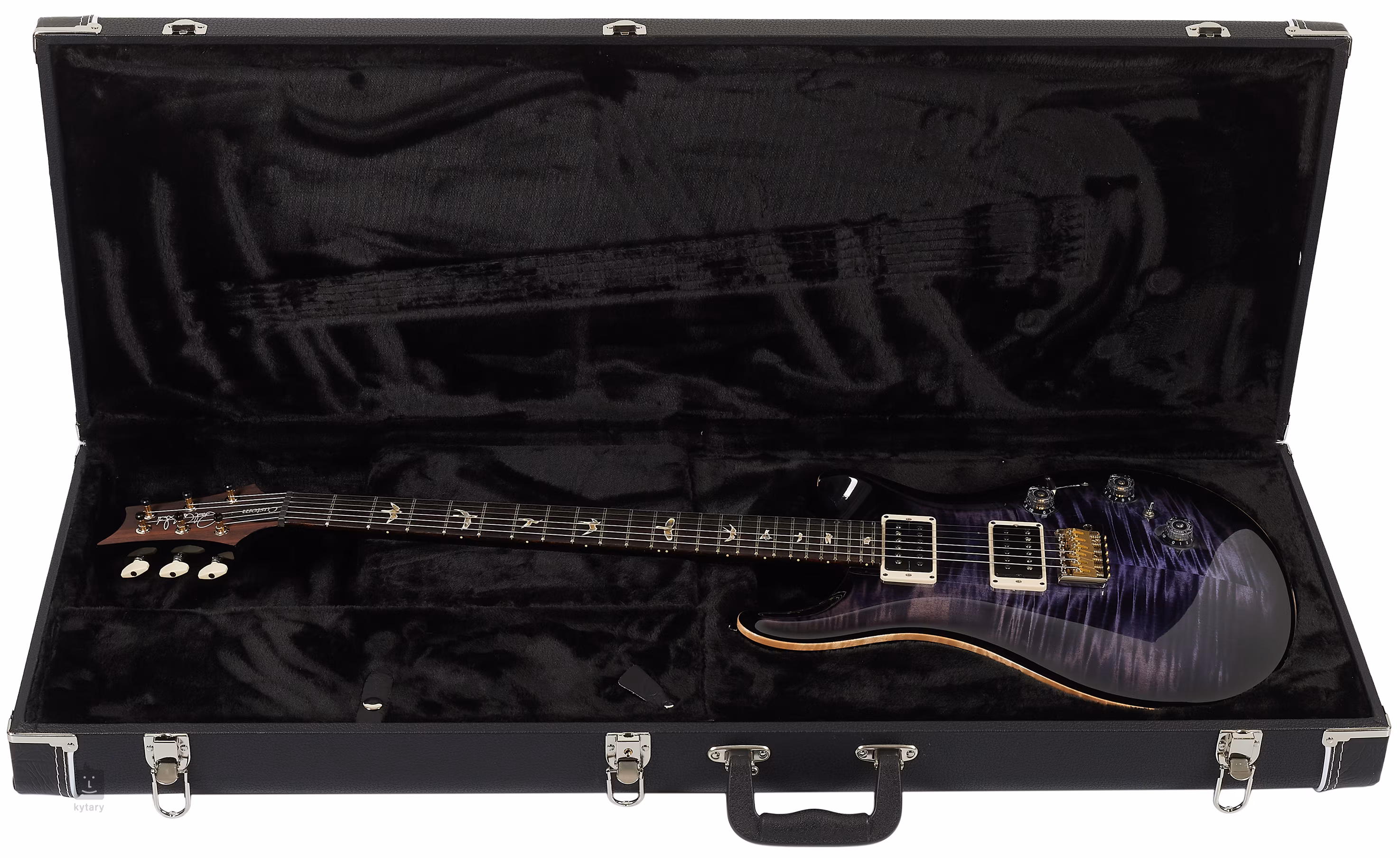 Das Modell Custom 24 Piezo Purple Mist besticht auf den ersten Blick durch die Kombination aus ergonomisch geformtem Mahagonikorpus mit dem typischen PRS-Double-Cutaway und einer gemaserten Ahorndecke mit cooler Holzmaserung. Ein einteiliger Mahagoni-Hals mit Pattern Thin-Profil ist mit einem Palisander-Griffbrett mit vierundzwanzig Bünden verleimt. Die Orientierung auf dem Griffbrett wird durch die PRS-typischen Positionsmarkierungen in Form von perlmuttfarbenen Vogelsilhouetten erleichtert.