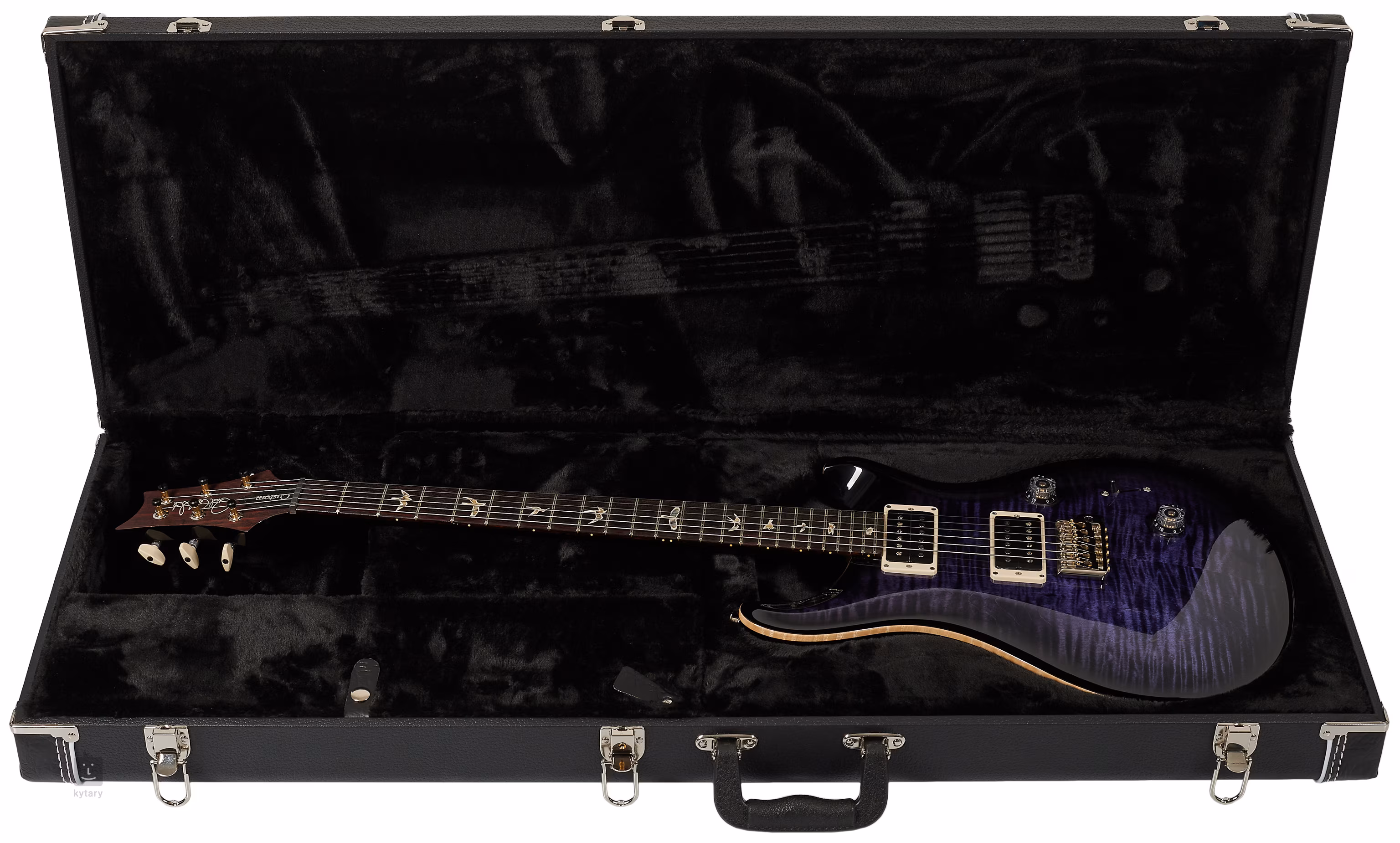 Das Modell Custom 24 Purple Mist besticht auf den ersten Blick durch die Kombination aus einem ergonomisch geformten Mahagonikorpus mit dem typischen PRS-Double-Cutaway und einer gemaserten Ahorndecke mit kühler Holzmaserung. Ein einteiliger Mahagoni-Hals mit Pattern Thin Profil wird durch ein Palisander-Griffbrett mit vierundzwanzig Bünden ergänzt. Die Orientierung auf dem Griffbrett wird durch die PRS-typischen Positionsmarker in Form von perlmuttfarbenen Vogelsilhouetten erleichtert.