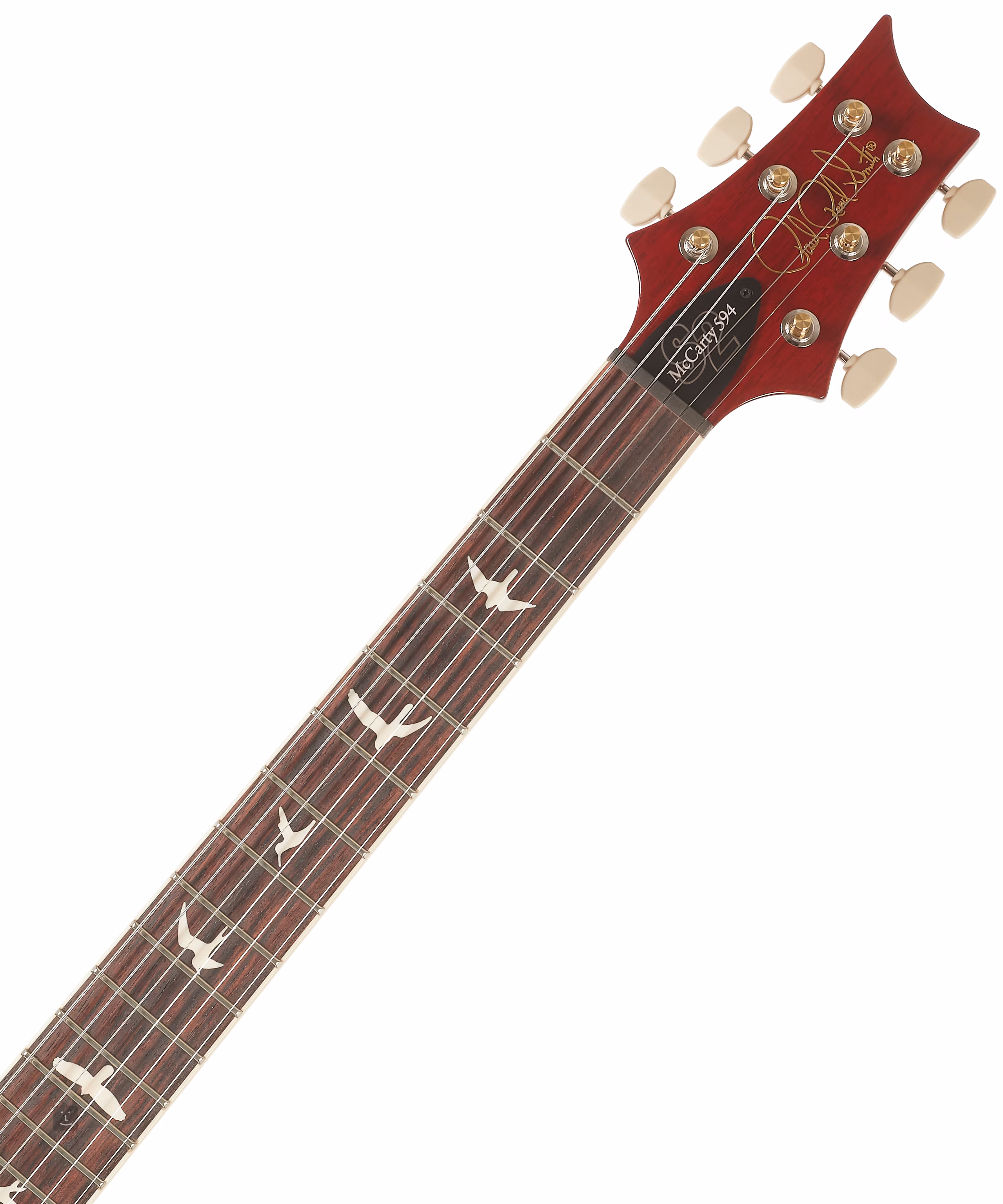 Der schmalere Korpus der S2 McCarty 594 Thinline Standard Vintage Cherry ist aus Mahagoni gefertigt. Deutlich abgeschrägte Korpuskanten fördern die allgemeine Spielergonomie. Der Mahagoni-Hals mit Pattern Thin-Profil ist mit einem Palisander-Griffbrett mit zweiundzwanzig Bünden verleimt. Die kürzere Mensur der Gitarre (625 mm) findet sich natürlich in der Modellbezeichnung McCarty 594 (24,594 Zoll) wieder. Positionsmarkierungen in Form von Vogelsilhouetten aus Perlmutt erleichtern die Orientierung auf dem Griffbrett.