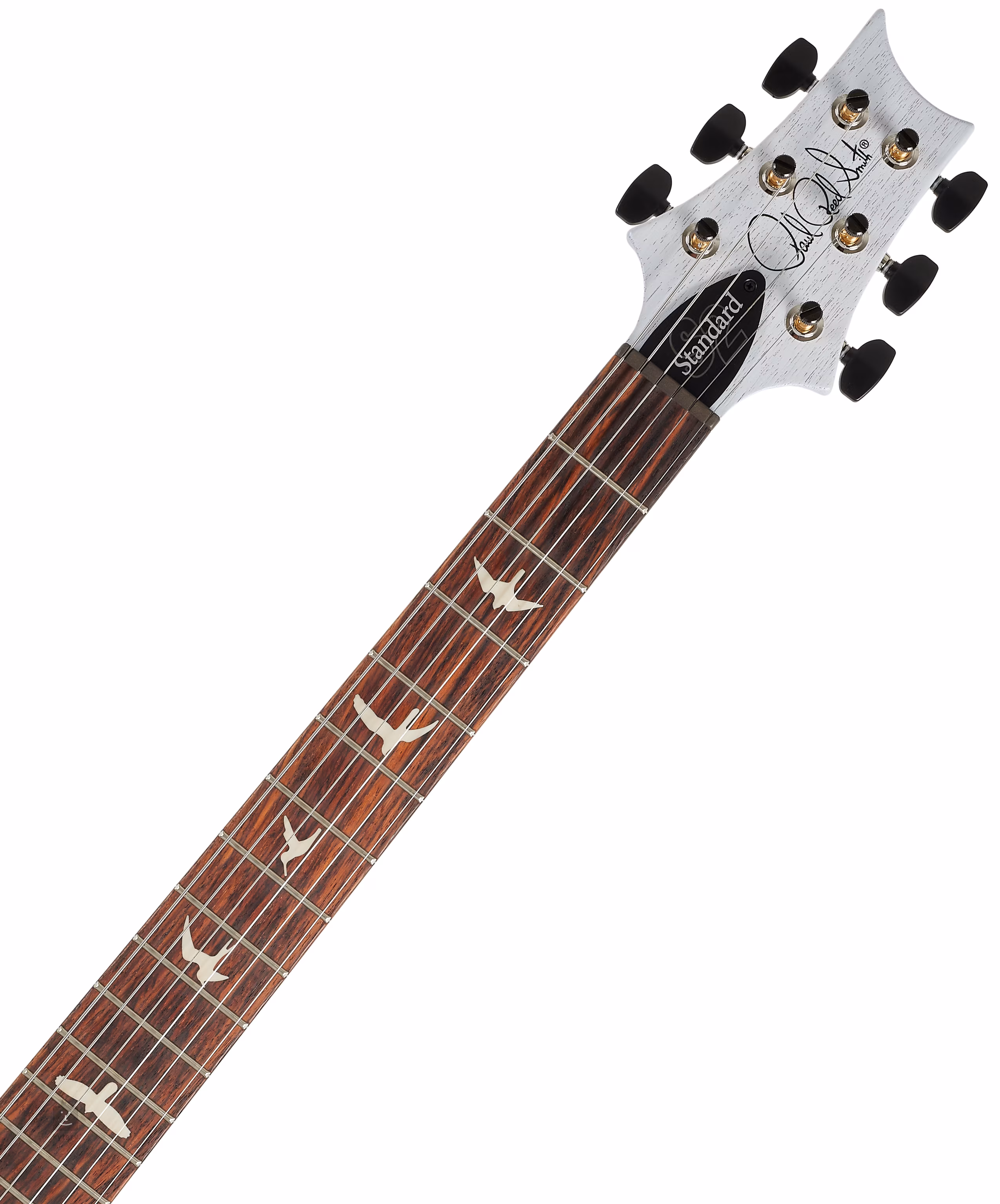 Der Mahagonikorpus der S2 Standard 22 Satin Pearl White ist mit einer dünnen Schicht aus satiniertem Nitrolack überzogen. Ein Palisander-Griffbrett mit zweiundzwanzig Bünden ist auf einen Mahagoni-Hals mit Pattern Regular-Profil geleimt. Positionsmarkierungen in Form von Vogelsilhouetten erleichtern die Orientierung auf dem Griffbrett.