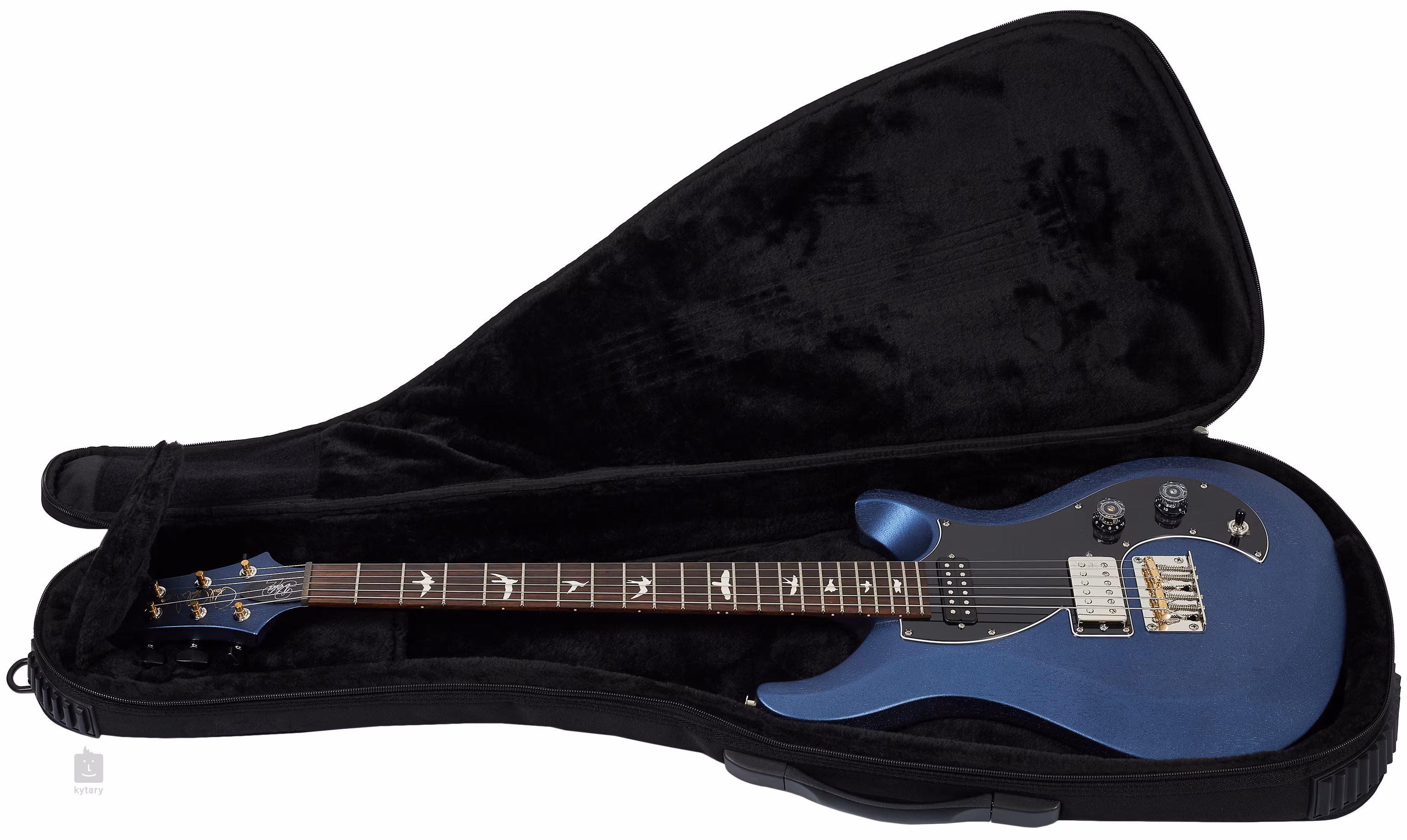 Der Mahagonikorpus der S2 Vela Satin Metallic Midnight ist mit einer satinierten Nitrolackierung versehen. Ein Palisander-Griffbrett mit zweiundzwanzig Bünden ist auf den Mahagoni-Hals mit Pattern Regular-Profil geleimt. Positionsmarkierungen in Form von Vogelsilhouetten erleichtern die Orientierung auf dem Griffbrett.