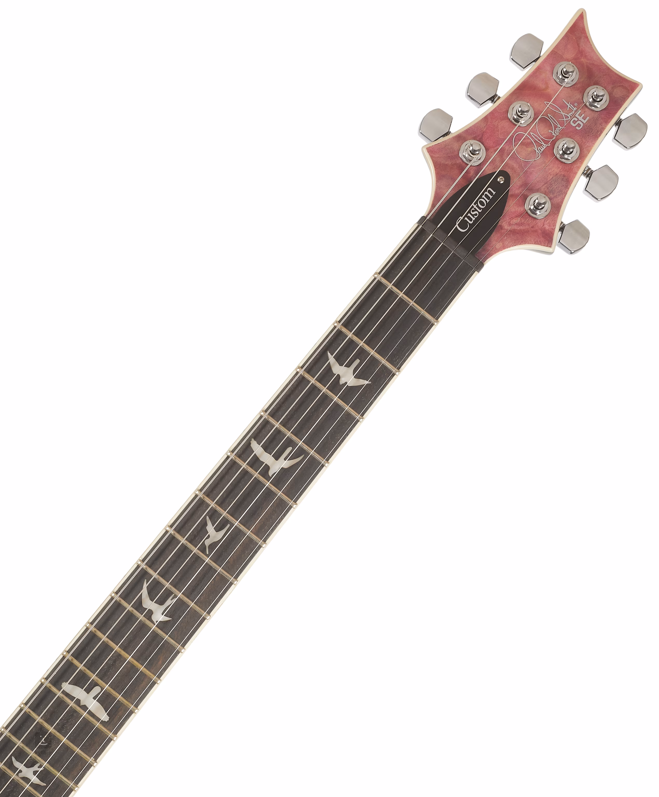 Der Mahagonikorpus der SE Custom 24 Quilt Package Violet Gitarre ist mit einer Ahorndecke und einer spektakulären Wolkenahorn-Furnierdecke verziert, die auch für die Kopfplatte verwendet wird. Das Shallow Violin Carve bringt die Spielbarkeit des Instruments qualitativ näher an die teureren Modelle der American Core Series. Ein Ebenholzgriffbrett mit vierundzwanzig Bünden ist auf einen Ahornhals mit Wide Thin-Profil geleimt. Positionsmarkierungen in Form von Vogel-Silhouetten aus Perlmutt erleichtern die Orientierung auf dem Griffbrett.