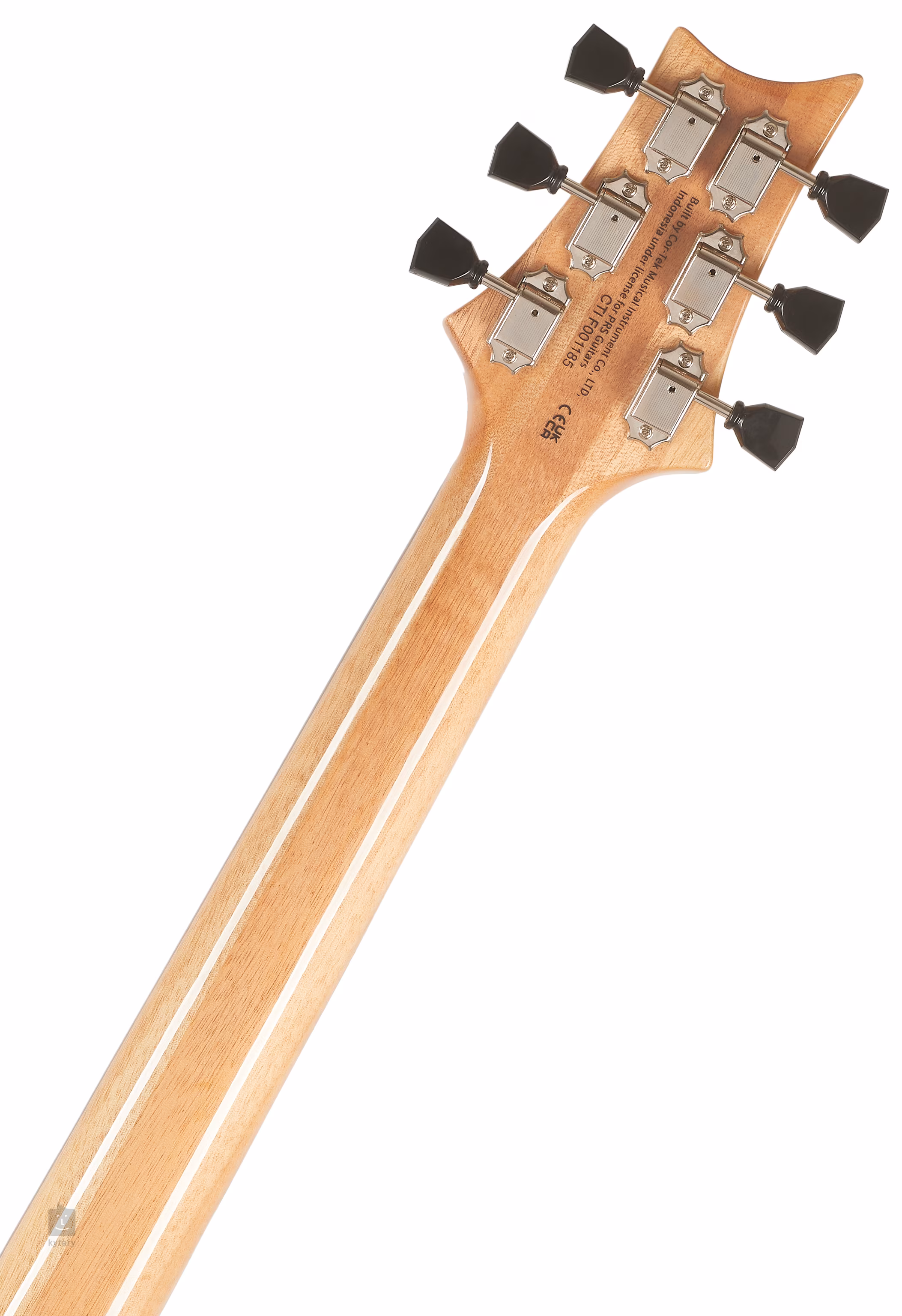 Schon auf den ersten Blick fällt die Gitarre durch ihren massiven, ergonomisch geformten Mahagonikorpus mit dem typischen doppelten PRS-Cutaway, der geschnitzten Ahorndecke und dem beeindruckenden Furnier aus geflammtem Ahorn auf. Die Shallow Violin-Schnitzerei bringt die Spielqualität des Instruments näher an die teureren Modelle der American Core Series. Ein Mahagoni-Hals mit Wide Fat-Profil ist auf einen Palisanderhals geleimt, der mit zweiundzwanzig Bünden ausgestattet und mit den traditionellen PRS-Positionsmarkern mit Vogelsilhouetten verziert ist.