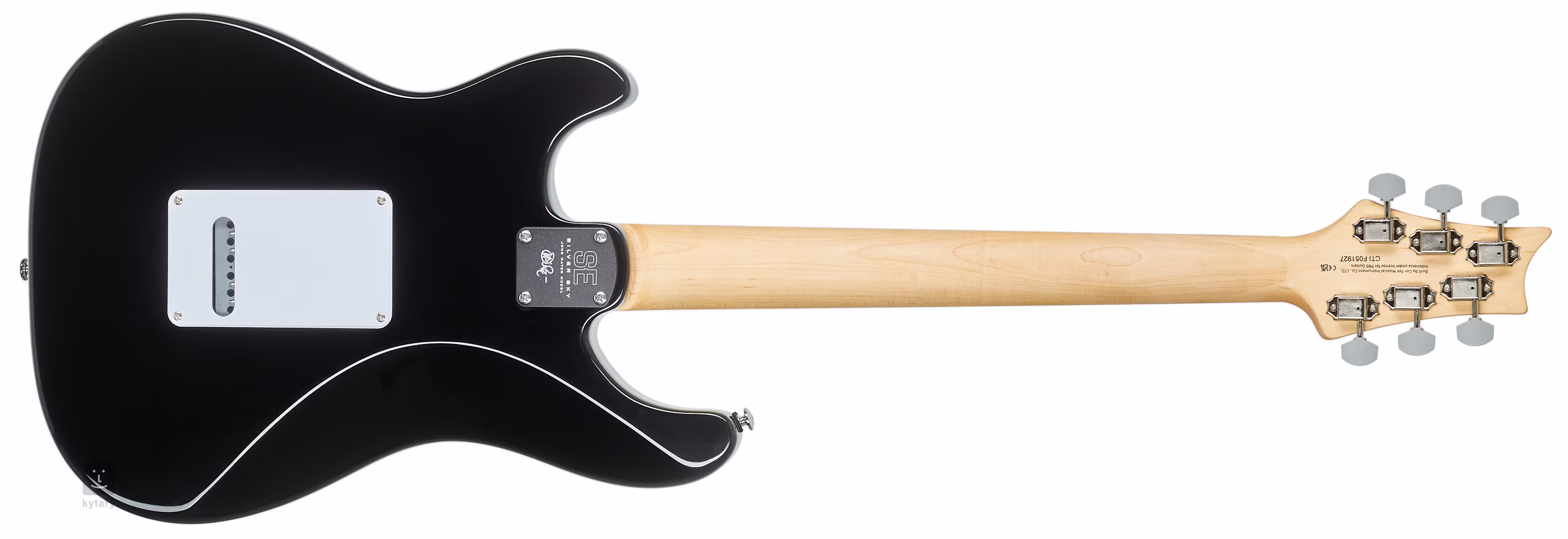 Der Korpus der PRS SE Silver Sky Rosewood Piano Black ist aus Pappelholz gefertigt. Ein Palisandergriffbrett mit zweiundzwanzig Bünden ist auf einen verschraubten Ahornhals geklebt. Der Hals weist das originale 635JM Cutaway/Profil auf, und Positionsmarkierungen in Form von Vogelsilhouetten erleichtern die Orientierung auf dem Griffbrett.