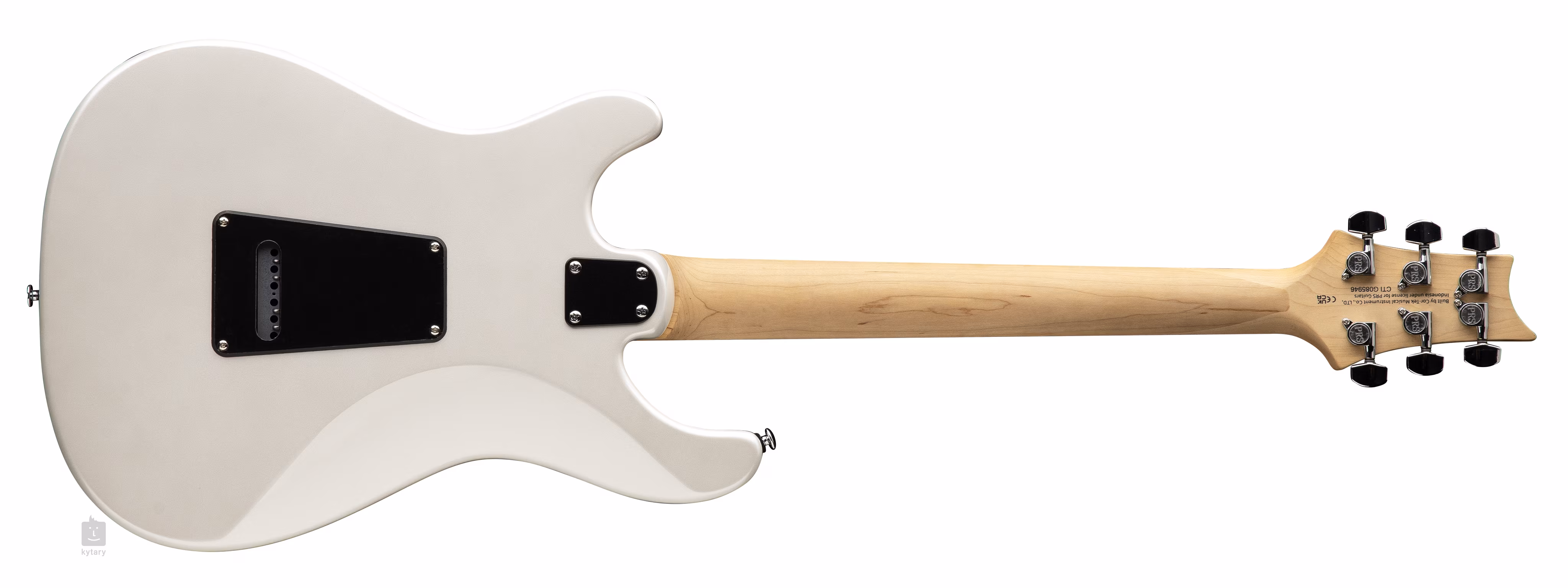 Der Korpus der PRS SE Studio Standard Pearl White E-Gitarre mit dem typischen PRS Double Cut ist aus Mahagoni gefertigt. Ein Palisandergriffbrett mit zweiundzwanzig Bünden ist auf einen geschraubten Ahornhals mit Wide Thin Profil geklebt. Die Orientierung auf dem Griffbrett wird durch PRS-Positionsmarker in Form von Vogelsilhouetten erleichtert.