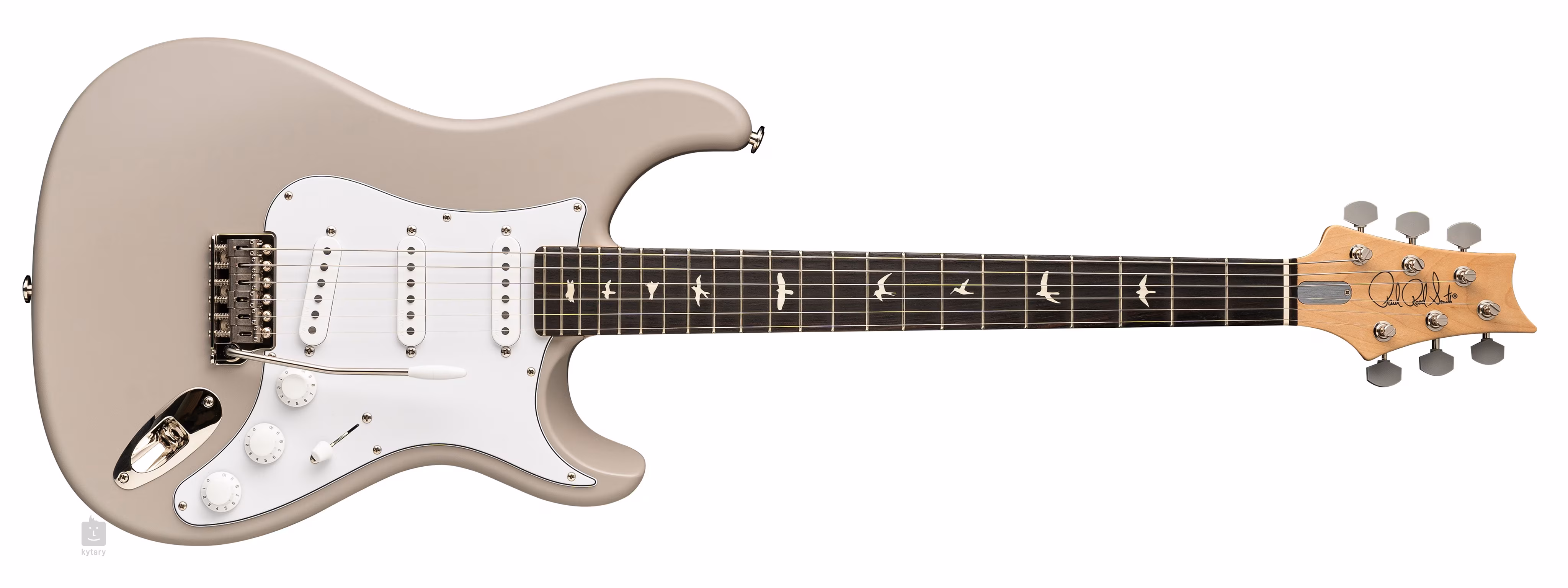 Die Stimmstabilität wird durch die Befestigung der Saiten an der arretierbaren Vintage-Mechanik und das Stahltremolo gewährleistet, das mit PRS-Elementen in Form eines Tremolohebels und Gen III-Schrauben (Messerschneide) angereichert ist. Zu den weiteren Besonderheiten des Instruments gehören eine Kopfplatte mit dem für PRS typischen invertierten Design, ein Griffbrett aus Knochen oder eine signierte Halsplatte. Das stilvolle Finish wird durch ein weißes Schlagbrett akzentuiert.