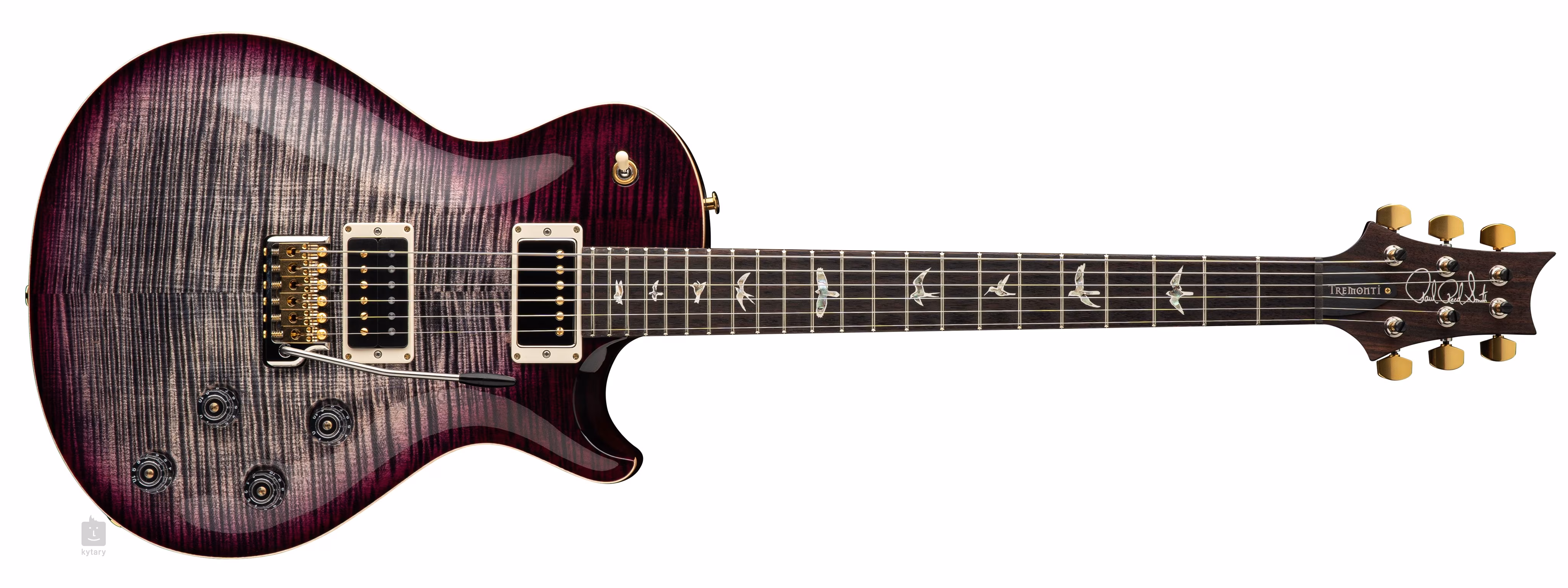 Die Single-Cut Tremonti Trem Charcoal Purple Burst ist das Signature-Modell von Mark Tremonti, dem amerikanischen Gitarristen, der durch die Bands Creed und Alter Bridge bekannt ist. Der ergonomisch geformte Mahagoni-Korpus ist mit einer gemaserten Ahorndecke und einer glänzenden Nitro-Lackierung versehen. Ein einteiliger Mahagoni-Hals mit Pattern Thin-Profil ist auf ein Palisander-Griffbrett mit zweiundzwanzig Bünden geleimt. Die Orientierung auf dem Griffbrett wird durch die charakteristischen PRS-Positionsmarkierungen in Form von luxuriösen Perlmutt-Vogelsilhouetten erleichtert.