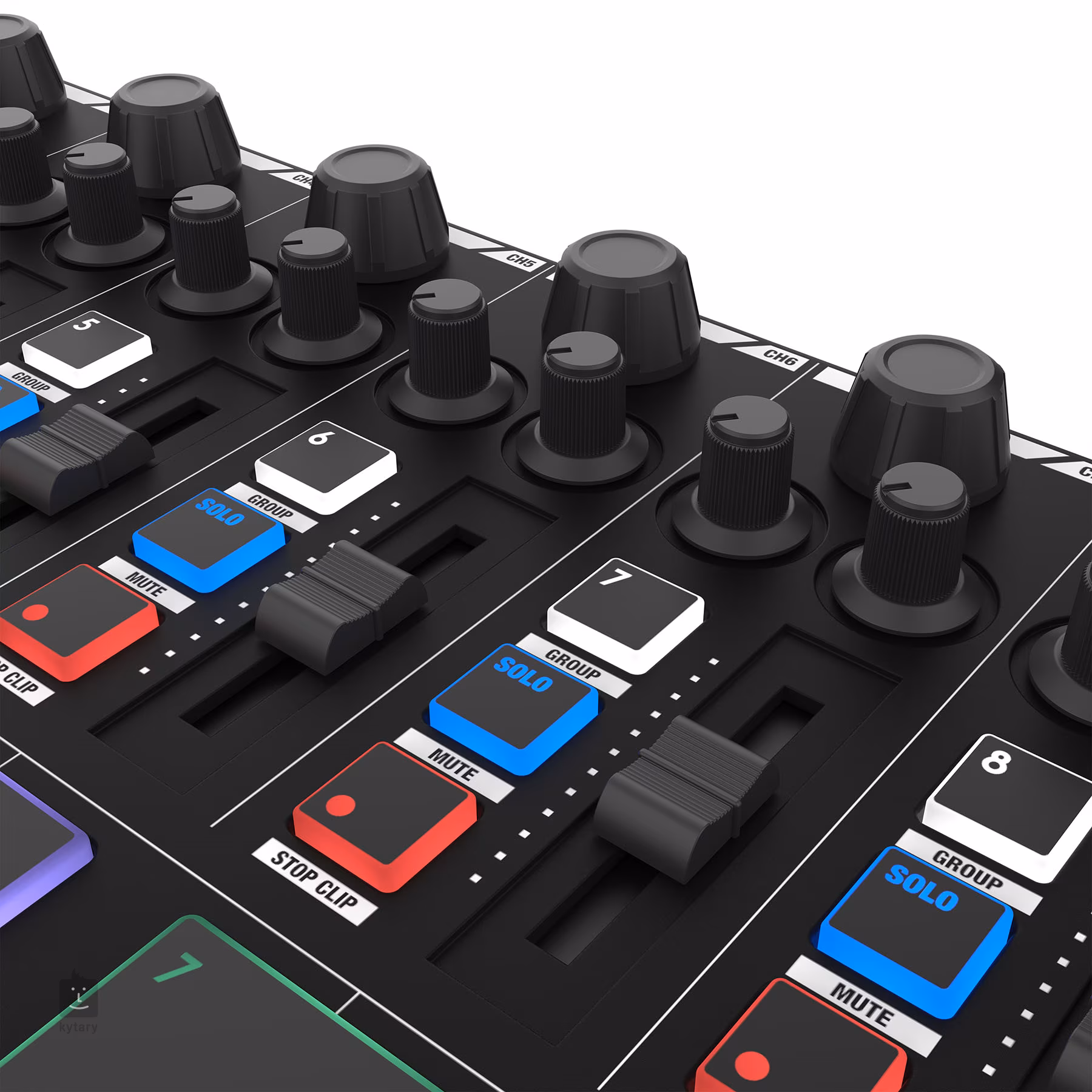 Die 16 drucksensitiven Drum-Pads bieten maximale kreative Flexibilität beim Komponieren von Beats und können auch zur Steuerung oder für MIDI-Befehle zum Ändern des Programms, zum Aktivieren bestimmter Effekte oder Plug-ins verwendet werden. Die Möglichkeiten werden durch die Aftertouch-Funktion und die RGB-Hintergrundbeleuchtung noch erweitert. Die Drum-Pad-Sektion kann auch zum Triggern von Clips (Play und Stop) verwendet werden.