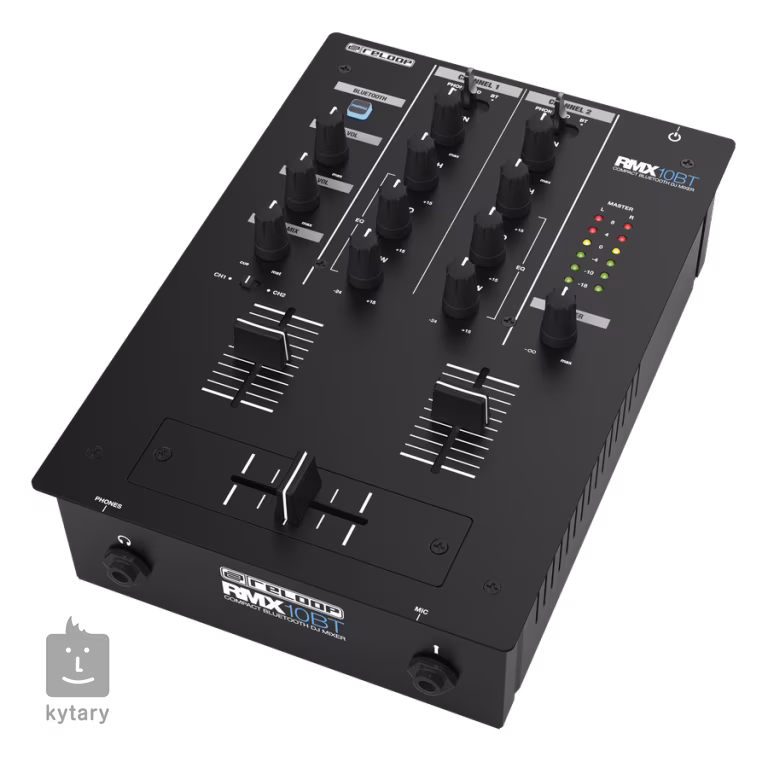 Der Reloop RMX-10BT besteht aus einem Bedienfeld, auf dem sich drei 45-mm-Fader befinden, von denen zwei zum Mischen des Eingangssignals dienen und einer eine Crossfader-Funktion hat. Über den Dreiband-EQ und den Lautstärkeregler können Sie das Signal weiter anpassen. Die Lautstärkeinformationen werden Ihnen über eine sechsstufige LED-Anzeige übermittelt. Auf der Vorderseite stehen Ihnen ein Kopfhörerausgang und ein Mikrofoneingang zur Verfügung, die sich z.B. für Spoken Word und Karaoke-Partys eignen.
