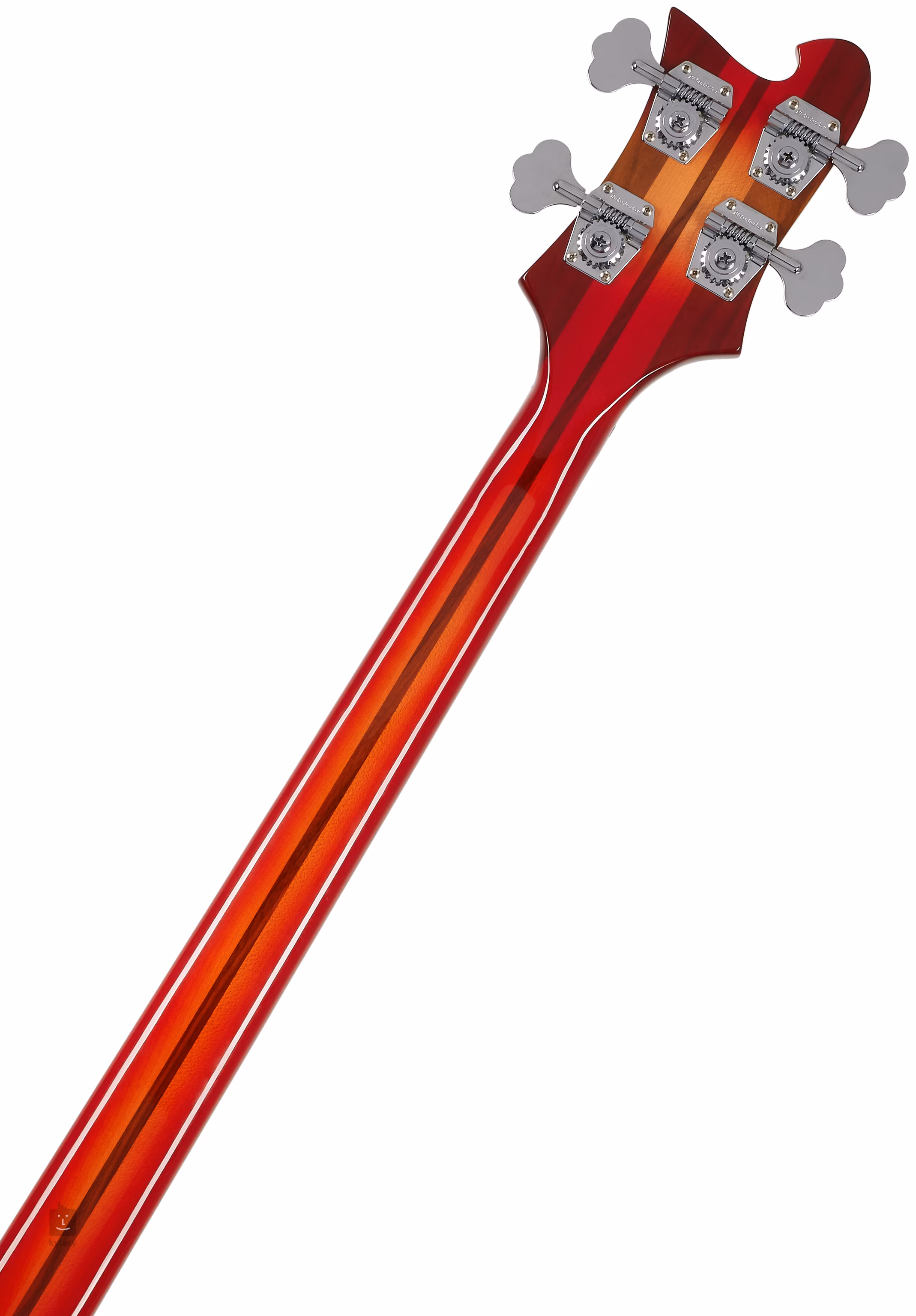 Ein Paar Single-Coil-Tonabnehmer lässt sich über passive Lautstärke- und Tonregler für jeden Tonabnehmer separat regeln, wobei ein dreistufiger Kippschalter für ausreichend Klangvariabilität sorgt. Es wurden hochwertige Schaller Deluxe-Mechaniken verwendet, und die verchromte Kopfplatte und der Halsstab stammen direkt aus der Rickenbacker-Werkstatt. Interessant ist auch das Ausgangspaar: Die Standard-Mono-Klinkenbuchse wird durch einen Stereo-Ausgang ergänzt, mit dem sich eine breite Palette von Klangmöglichkeiten erzielen lässt. Der Bass wurde in den USA handgefertigt und ein Hartschalenkoffer ist ebenfalls enthalten.