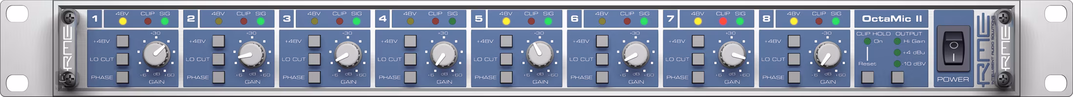 Der OctaMIC II verfügt über einen 8-Kanal-Digitalausgang im ADAT-Format mit 96 kHz Samplefrequenz-Unterstützung sowie im AES-Format (DB-25-Anschluss) mit 192 kHz-Unterstützung. Die SteadyClock-Technologie zur maximalen Korrektur von Jitter und Ungenauigkeiten bei der Wandlung sorgt für maximale Klangqualität bei absoluter Unabhängigkeit von der Genauigkeit und Qualität des Kontrollsynchrontakts".