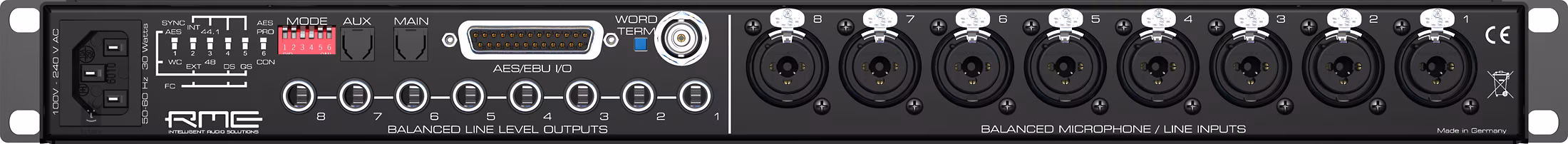 Über Schalter an der Vorderseite kann der Ausgangspegel auf -10 dBu, +4 dBu oder HIGain (+19 dBu) eingestellt werden. Diese Besonderheit hat den Vorteil, dass der Ausgangspegel an jedes R.M.E.-System (von Fireface 800, Multiface und HDSP 9632 bis hin zu Wandlern der ADI-Serie) angepasst werden kann.