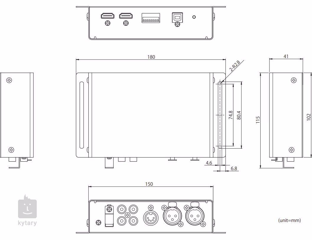 Das Gerät verfügt über einen HDMI-Anschluss (In, Thru) auf der Vorderseite und einen USB-Anschluss, der für die MIDI-Kommunikation genutzt werden kann. Auf der Rückseite befinden sich zwei DMX-Ausgänge (3pin und 5pin), ein MIDI-Eingang (5pin) und zwei Paar Cinch-Anschlüsse für den Anschluss von Audiosignalen.