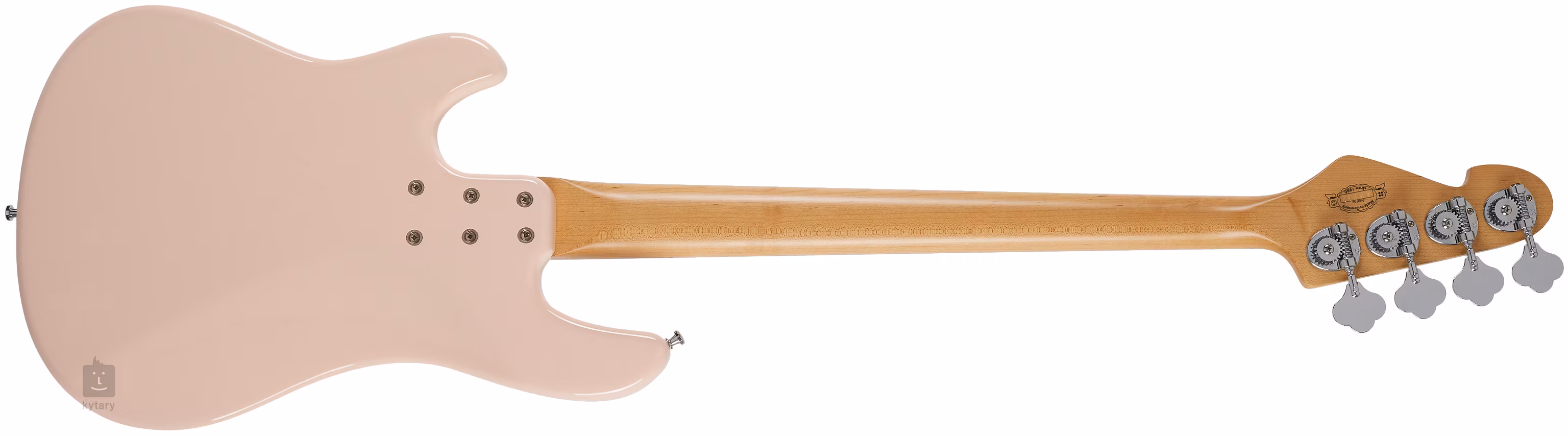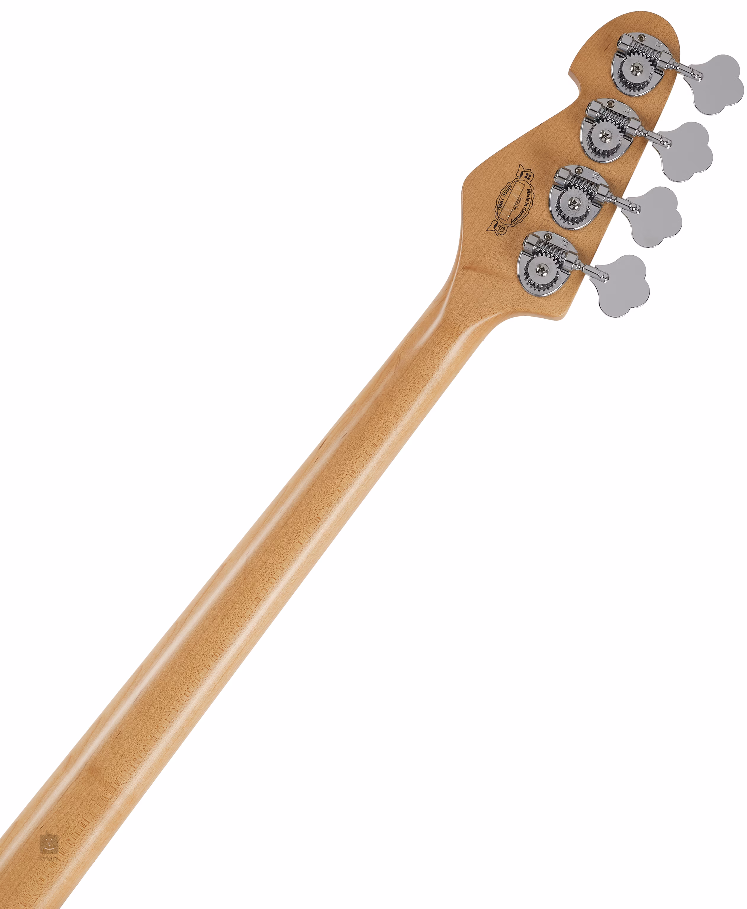Der Korpus dieses Basses ist aus Linde gefertigt, der Hals aus kanadischem Ahorn. Er ist mit sechs Schrauben verschraubt, die ihn in einer absolut präzisen Position halten. Das Griffbrett ist aus Ahorn und hat 22 Bünde. Die Mensur des Instruments beträgt 864 Millimeter.