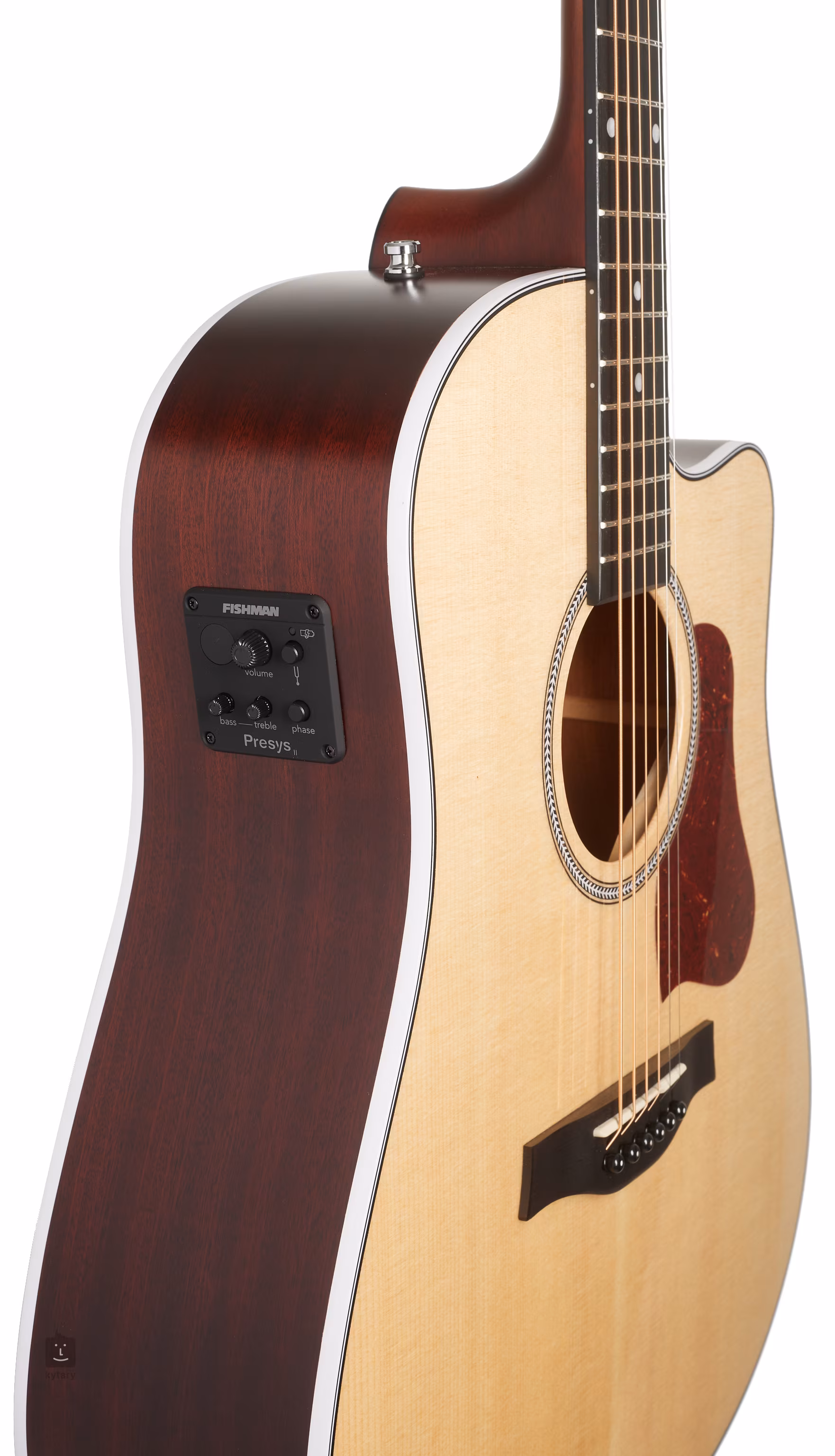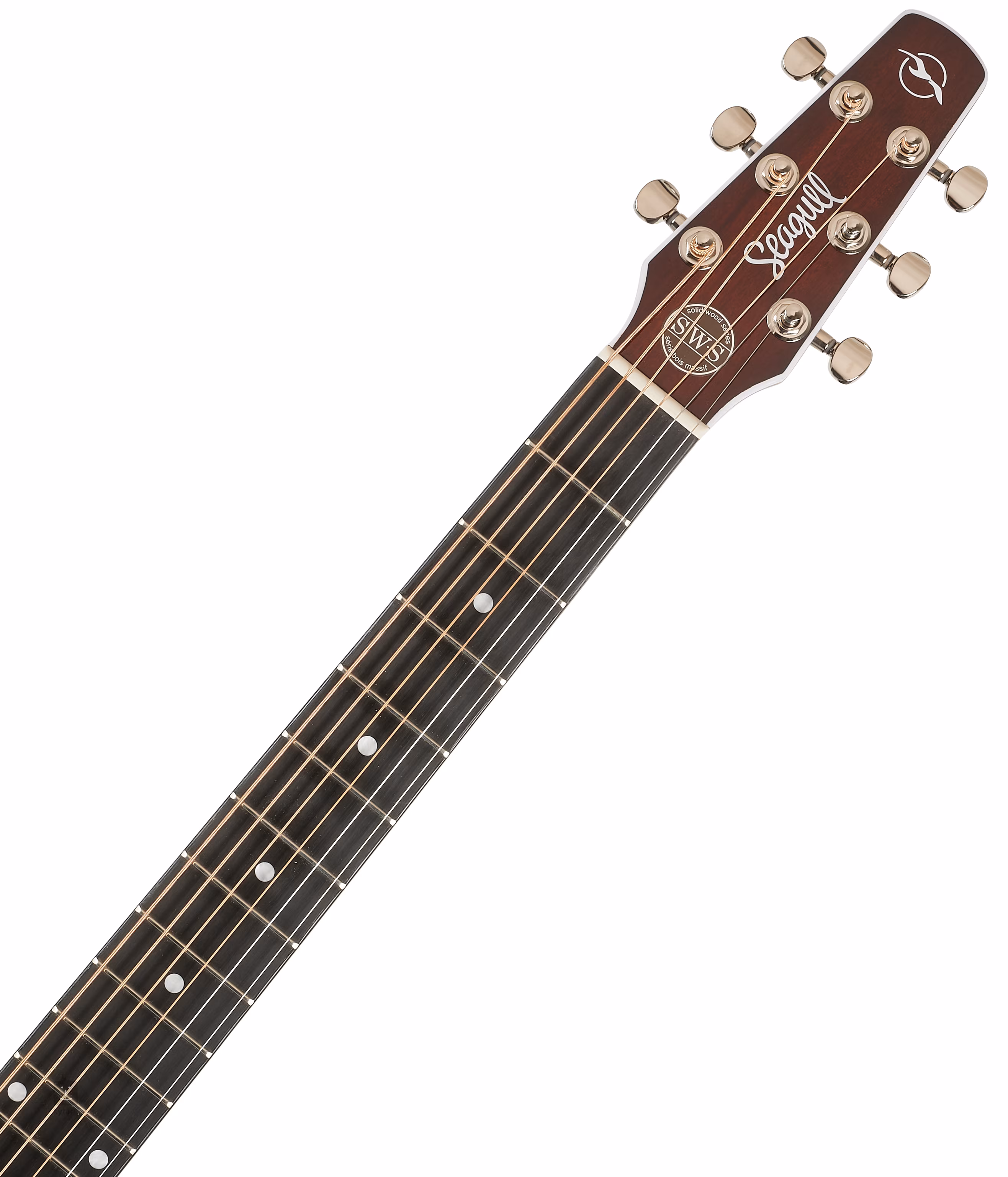 Zu den Optionen für die Klangverstärkung gehören ein Fishman Sonicore Piezo-Tonabnehmer und ein Fishman Presys II Vorverstärker mit Lautstärkeregler, Zweiband-EQ, Phase-Taste zur Unterdrückung von Rückkopplungen und integriertem Stimmgerät. Die Saiten sind in verchromten Stimmmechaniken und einem Ebenholz-Griffbrett montiert. Die schöne Verarbeitung wird durch die Fischgrät-Rosette, das doppelseitige weiße Korpusbinding, das Schlagbrett aus Schildpatt-Imitat und das Firmenlogo auf der typischen Seagull-Kopfplatte unterstrichen.
