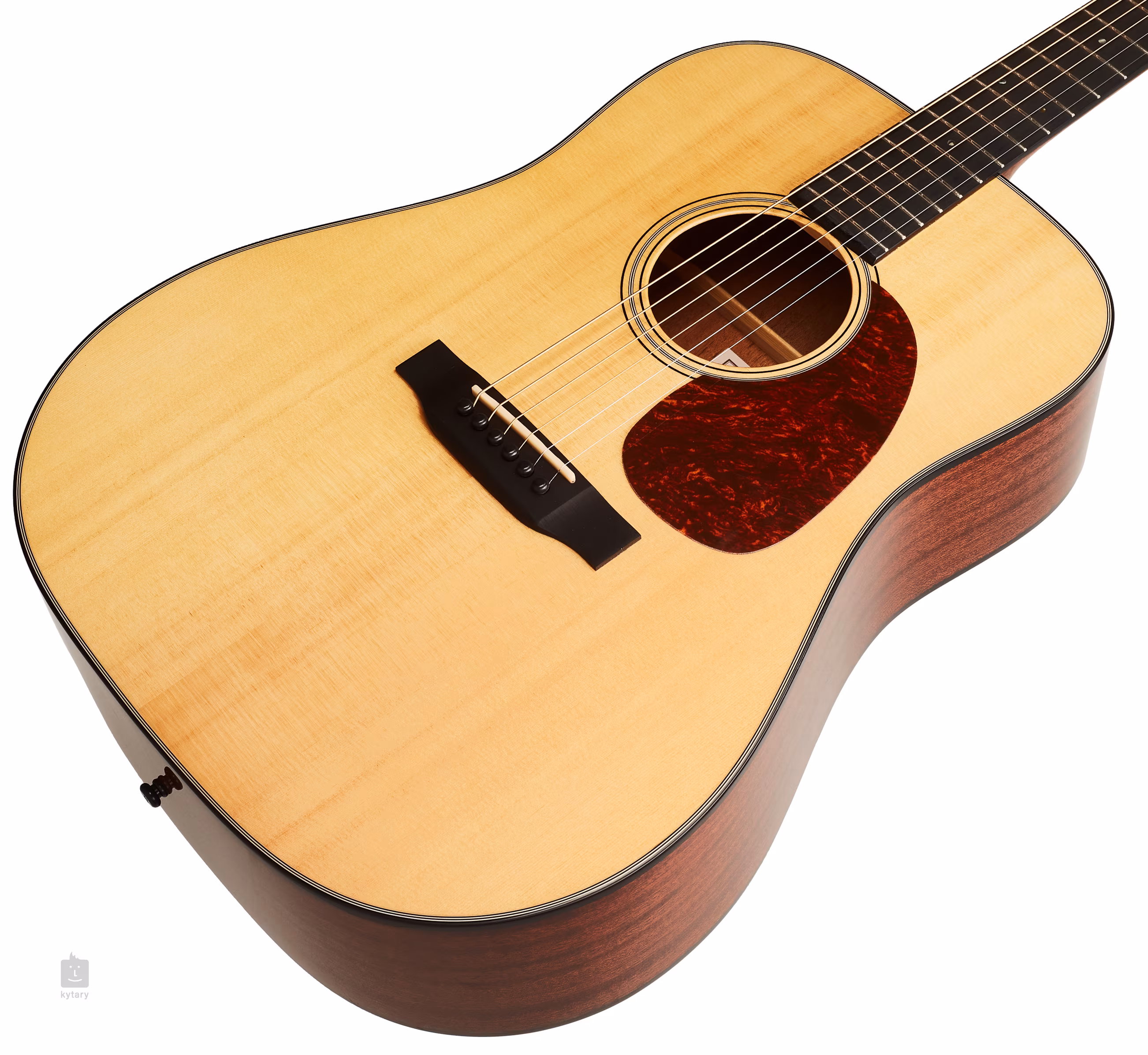 Der Sattel ist, wie der Nullbund, aus Knochen. Zum Stimmen werden offene Grover-Nickel-Mechaniken verwendet, und ein Schildpatt-Pickguard schützt den Lack vor Pick-Schlägen. Um den Resonanzboden herum befindet sich eine dekorative Rosette.