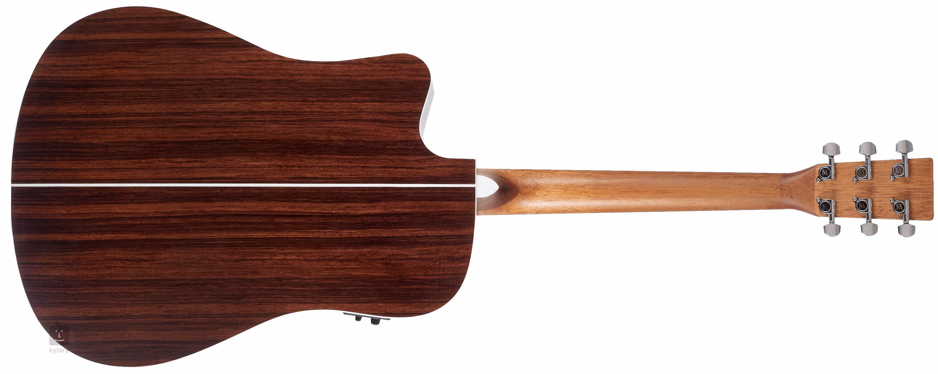 Für den Sound der Gitarre sorgen ein Fishman Sonicore-Tonabnehmer und ein Fishman-Vorverstärker mit Lautstärkeregler, Zweiband-EQ, Phase-Taste zur Unterdrückung von Rückkopplungen und eingebautem Stimmgerät. Die Saiten sind auf der einen Seite in verchromten Stimmmechaniken und auf der anderen Seite in einem Micarta-Griffbrett gelagert. Der Nullbund und der kompensierte Knochensattel garantieren eine ideale Schwingungsübertragung der Saiten. Das stilvolle Design wird durch das Schlagbrett aus Schildpattimitat, die dekorative Rosette, das weiße Binding mit schwarz-weißen Linien und das Logo auf der Kopfplatte unterstrichen.