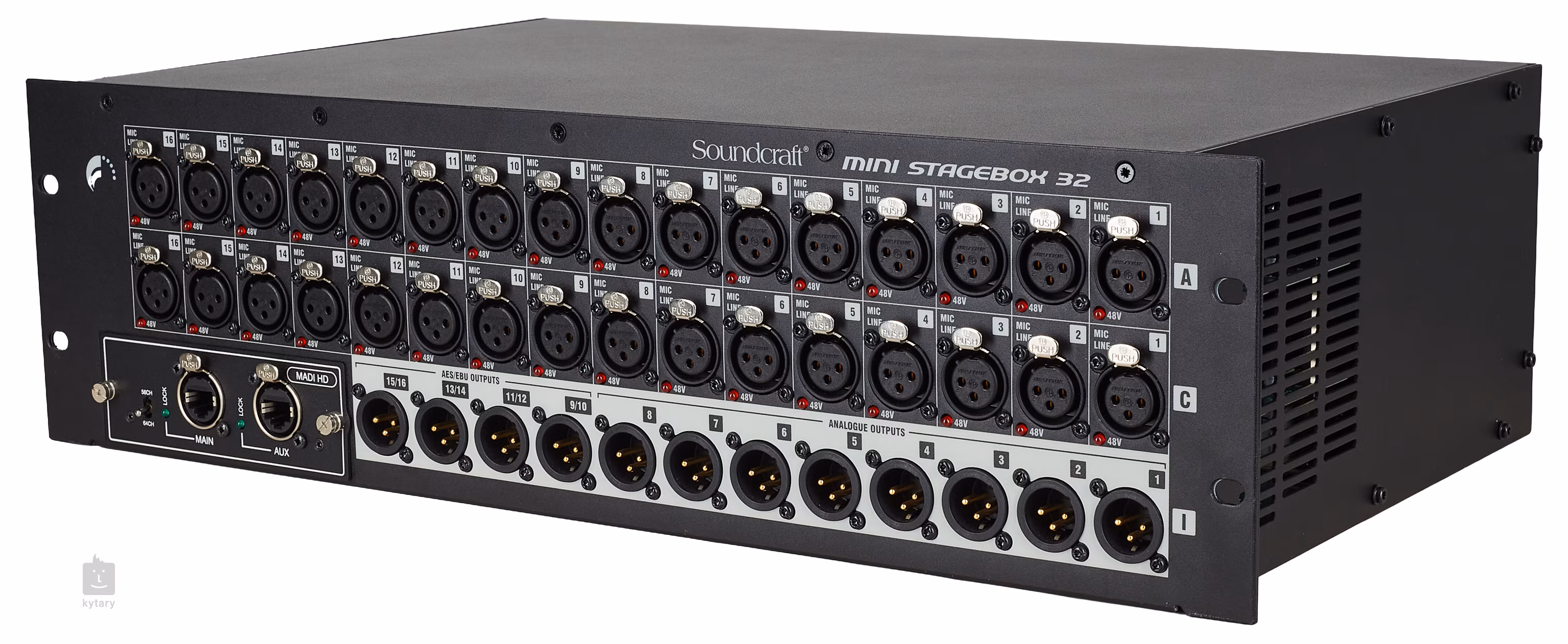 Die beiden Main/Aux-Ausgänge ermöglichen den gleichzeitigen Betrieb der Stagebox an zwei Mischpulten. Ähnlich wie das kleinere Modell 16R wird das AudioRack mit einer eingebauten MADI-Karte geliefert. Die seitlichen, leeren Bereiche des Racks bieten Platz für eine mögliche Erweiterung mit zusätzlichen Steckplätzen.