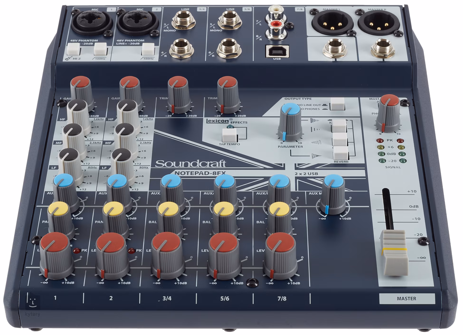 Die Mischpulte der Notepad-Serie bieten Soundcraft-Klangqualität in einem kompakten Paket. Das Notepad 8FX mix kombiniert professionelle analoge Komponenten, zuverlässige HARMAN Signalverarbeitung und ein USB-Audio-Interface zum Anschluss an Ihre bevorzugte Bearbeitungssoftware auf Ihrem PC oder Mac. Sie können das Ausgangssignal mit Lexicons ikonischen räumlichen Effekten wie Reverb, Echo und Delay mit Tap-Tempo weiter aufpeppen. Die Mikrofoneingänge mit Kombibuchsen (Jack 6.3/XLR) verfügen zusätzlich zu einem Dreiband-EQ über Hi-Z-Schalter und Hochpassfilter (HP-Filter). Das Mithören ist über einen Kopfhörerausgang mit separatem Lautstärkeregler möglich. Verwenden Sie das Notebook in Ihrem Heimstudio, für Podcasts, als unprätentiöses Tonstudio oder für Live-Auftritte.