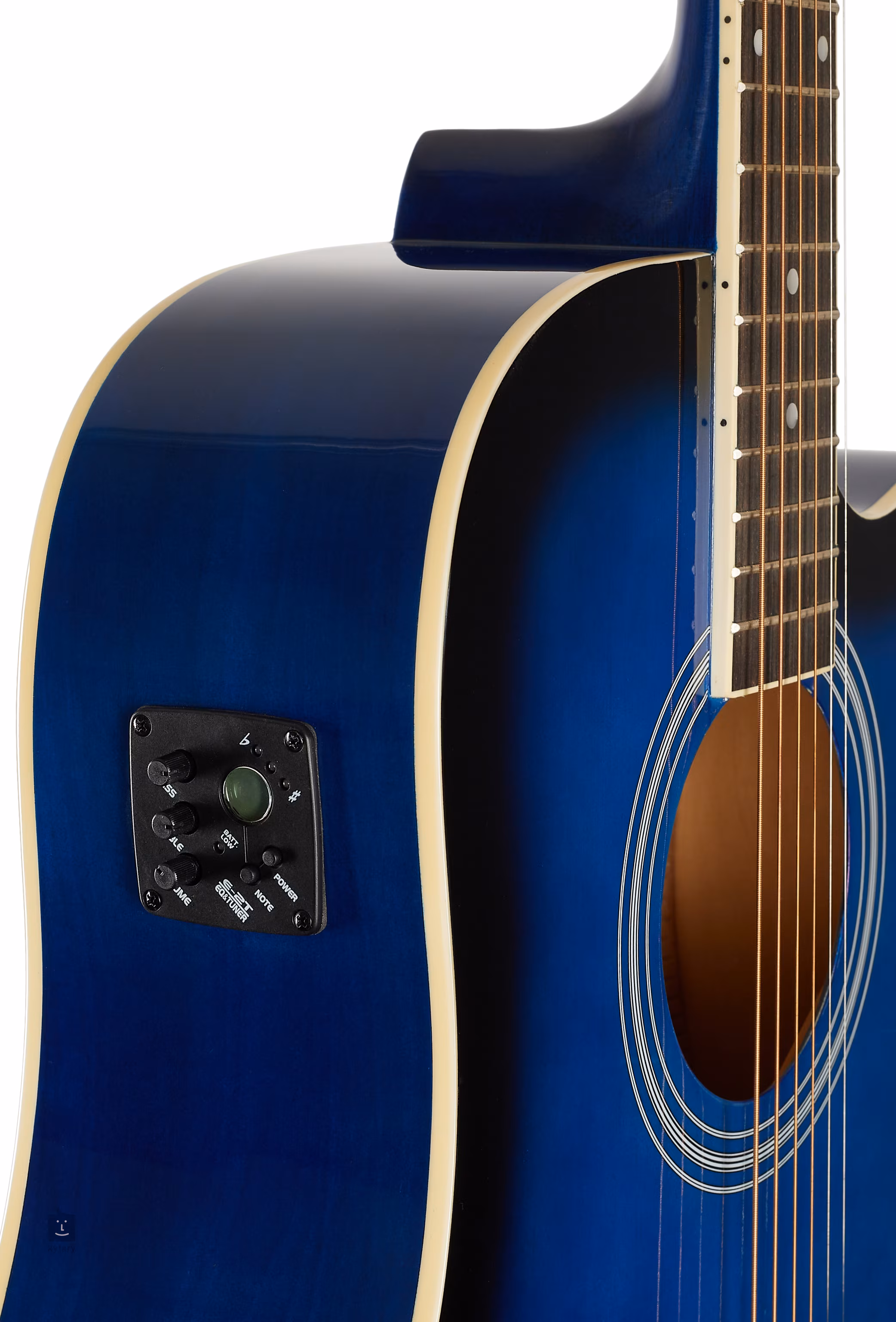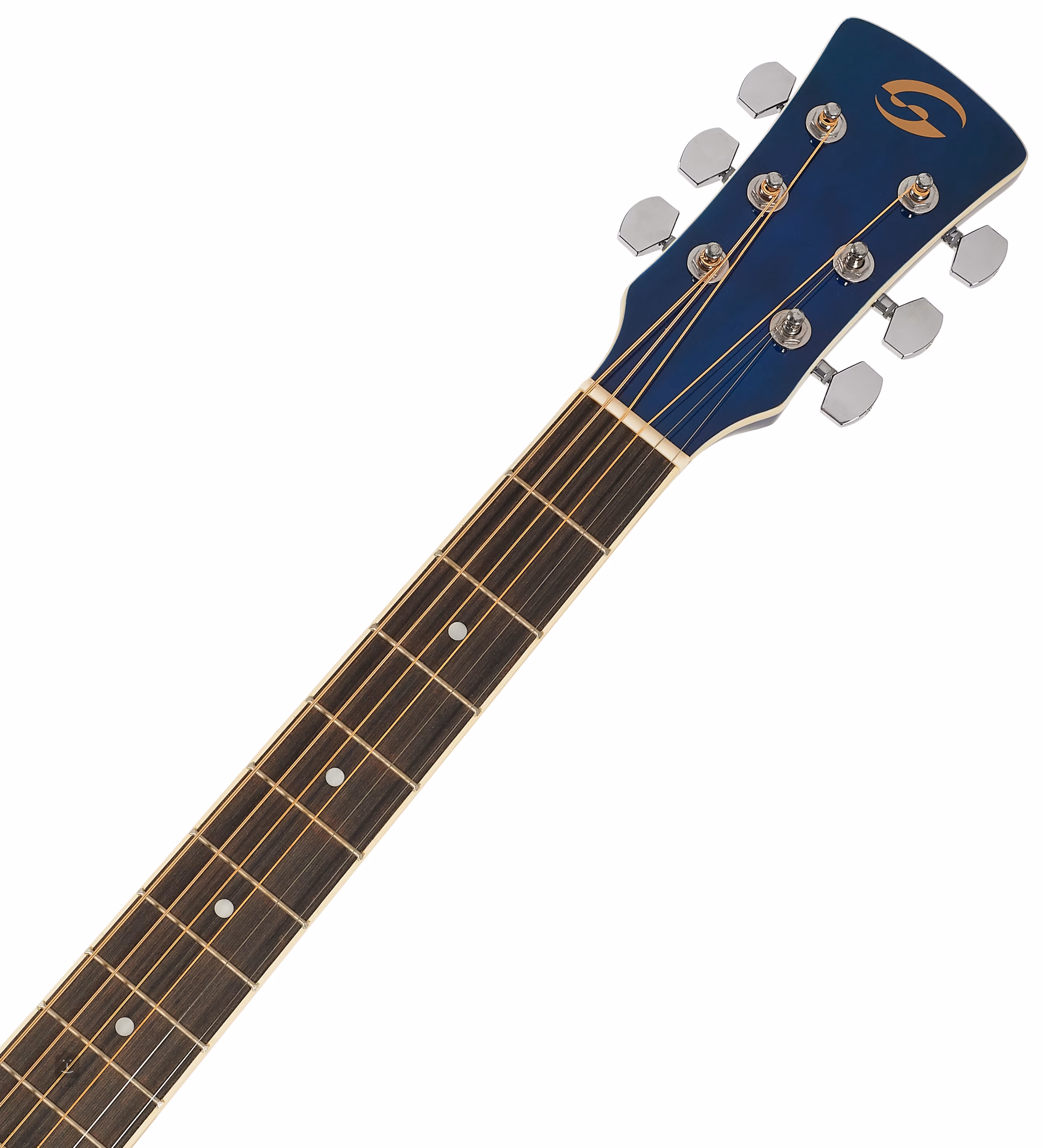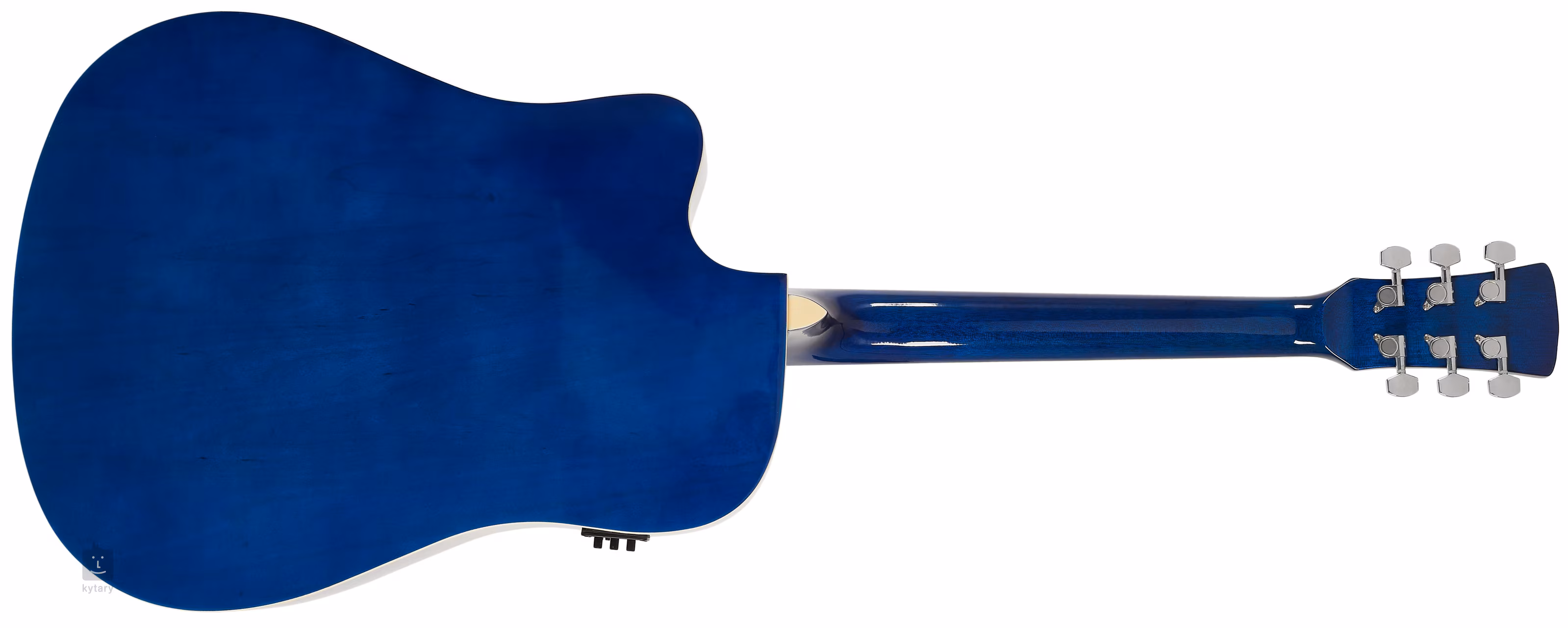 Die Vorderseite der elektroakustischen Gitarre YELLOWSTONE-DNCE-BLS besteht aus Fichtensperrholz, während Boden und Zargen aus Lindenholz gefertigt sind. Das Griffbrett aus Schwarzholz ist mit zwanzig Bünden ausgestattet, die Orientierung auf dem Griffbrett wird durch Positionspunkte erleichtert. Die Saiten werden in verchromten Druckguss-Mechaniken und einem Griffbrett aus Schwarzholz gehalten. Das Styling wird durch die Einfassung von Korpus, Hals und Griffbrett, die blaue Burst-Lackierung und das schwarze Schlagbrett akzentuiert.