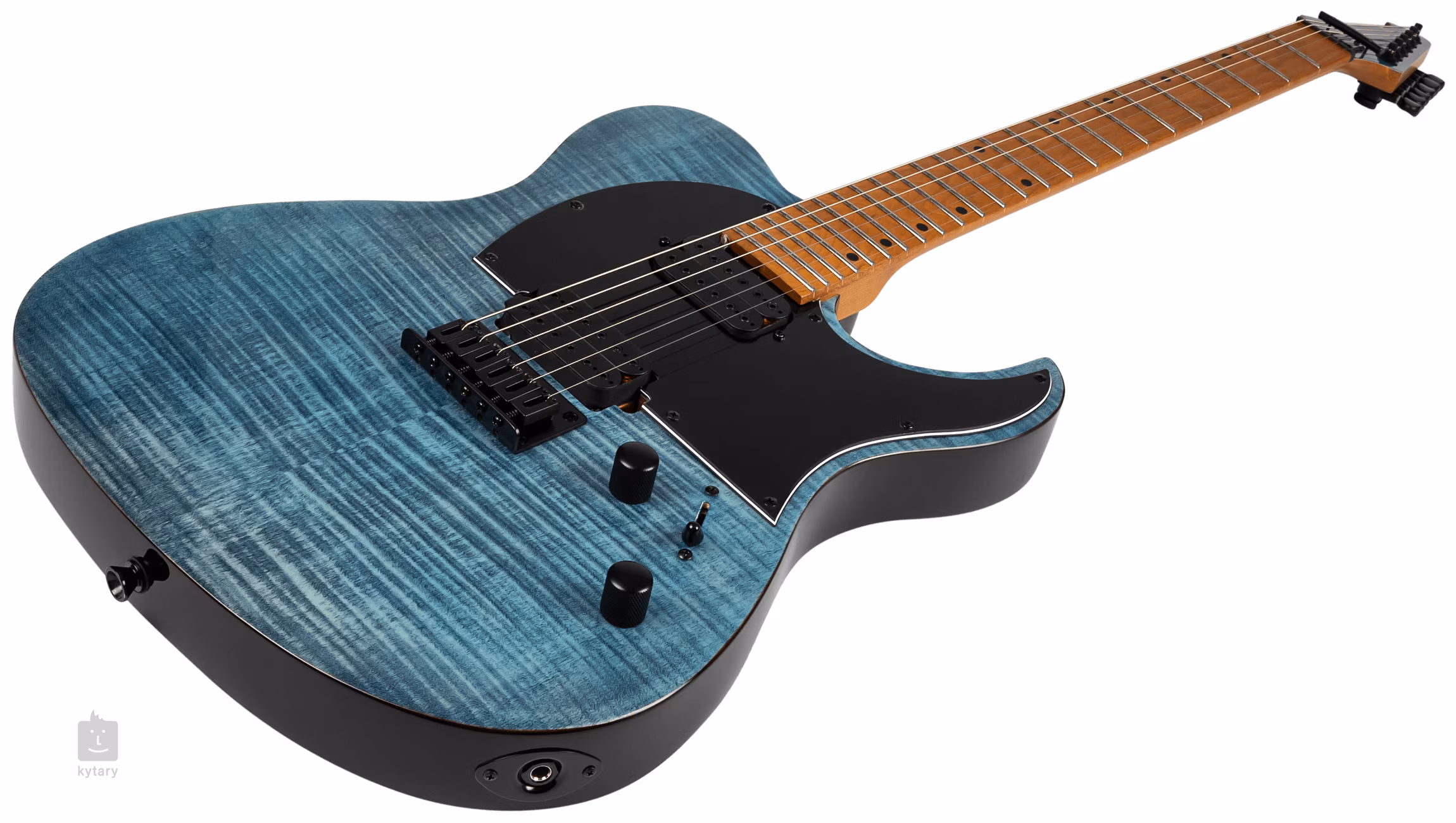 Der Pappelkorpus der Spira Guitars T-450 TDB E-Gitarre ist mit einem geflammten Ahorn-Deckenfurnier und einem Transparent Blue-Finish verziert. Auf den Hals aus kanadischem Ahorn mit einem "Modern D"-Profil ist ein Ahorn-Griffbrett mit vierundzwanzig Jumbo-Bünden geklebt. Die Wärmebehandlung von Korpus, Hals und Griffbrett macht das Holz stabiler.