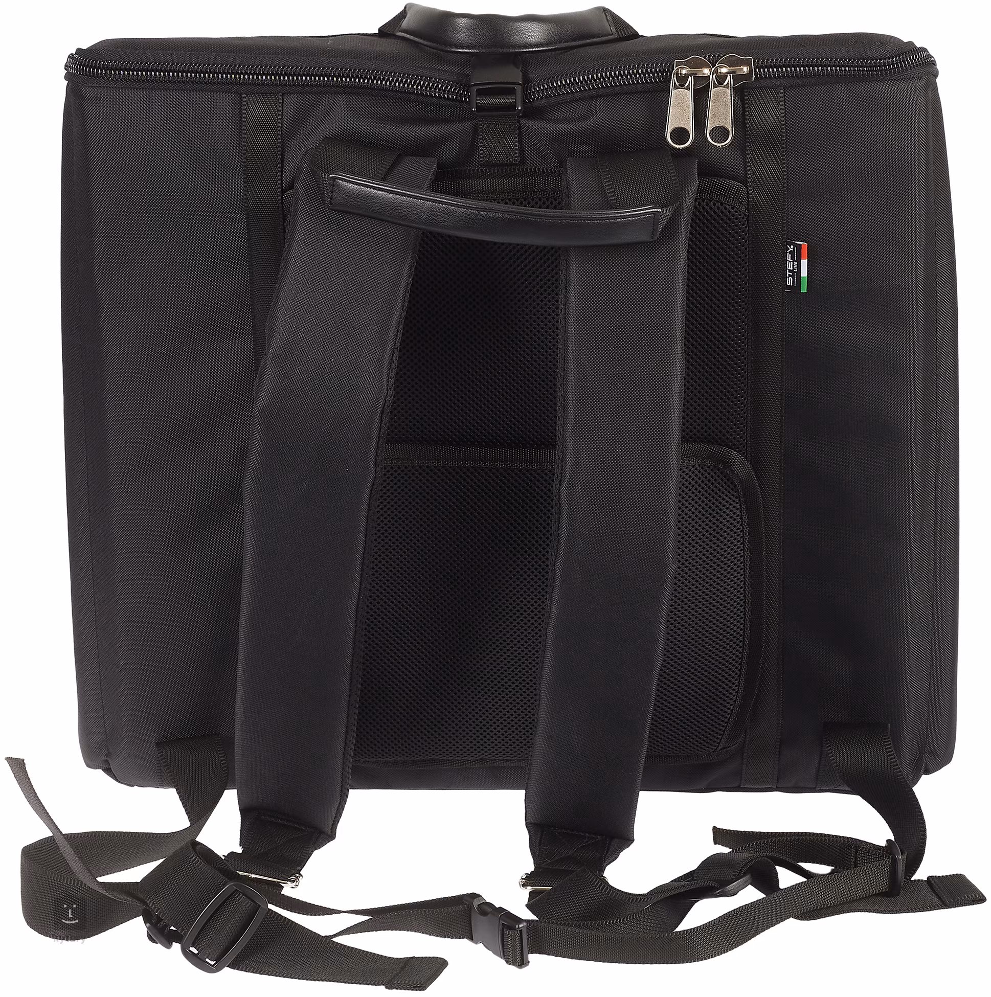 Der Stefy Line AB200 - 72 Akkordeonkoffer verfügt über eine Außenhülle aus wasserdichtem Polyester (Poly 600D), einen Innenraum mit 20 mm dicker Polsterung (gehärtetes Polyethylen), eine Tasche zur Aufbewahrung von Kleinzubehör, einen Tragegriff und Schulterriemen, so dass er auch als Rucksack getragen werden kann.