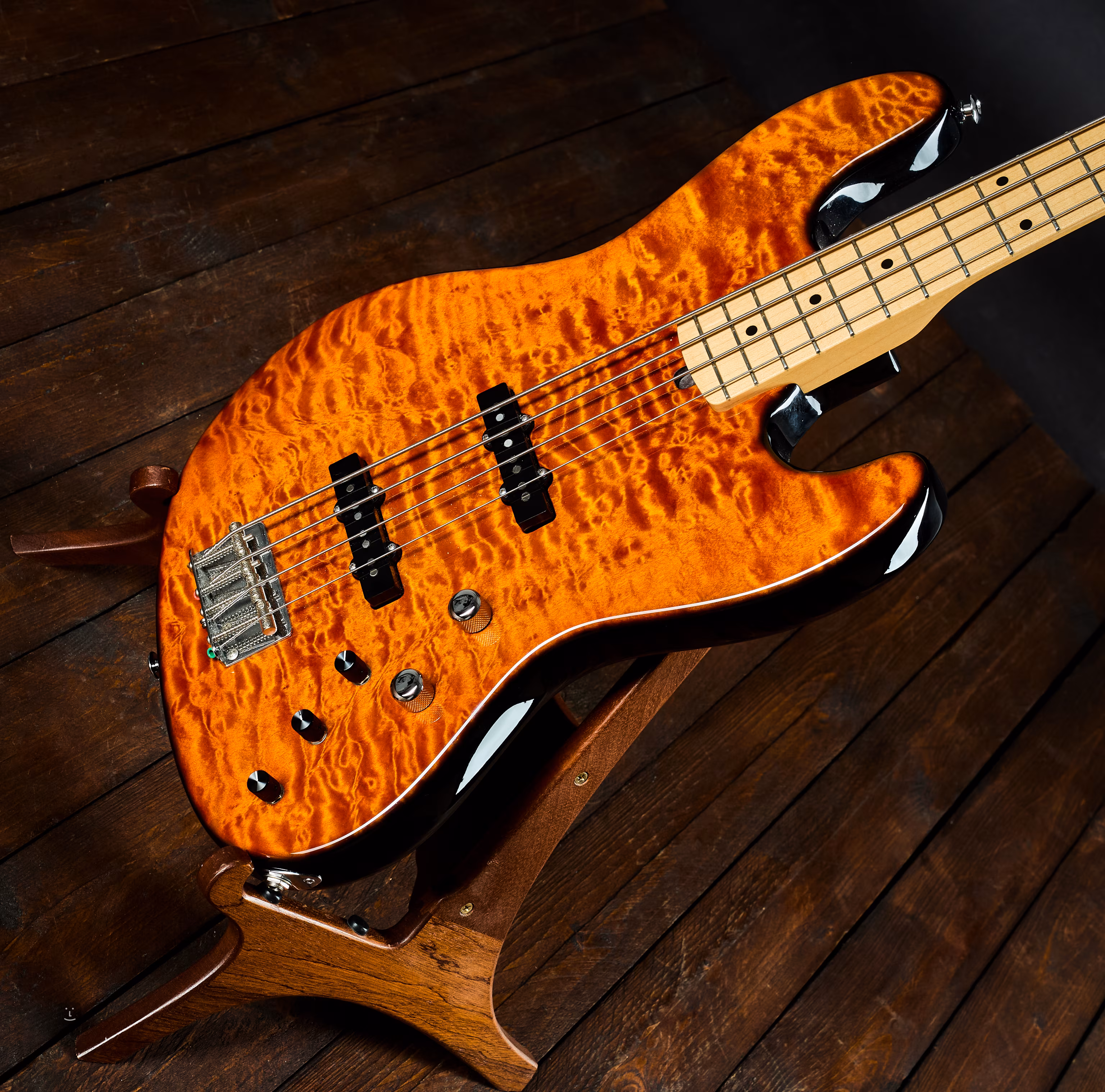 Der Hals ist aus Ahorn quartalsweise gesägt mit einem Ahorn-Griffbrett und komfortablen Abmessungen: Vintage J Profil: .810 - .930" mit einem 1.5" breiten Tusq Nullbund und einem Vintage 7.25" Radius. 20 Bünde, Typ Medium. Der Korpus ist aus Erle mit einer 3/16 Ahorndecke in Trans Orange.