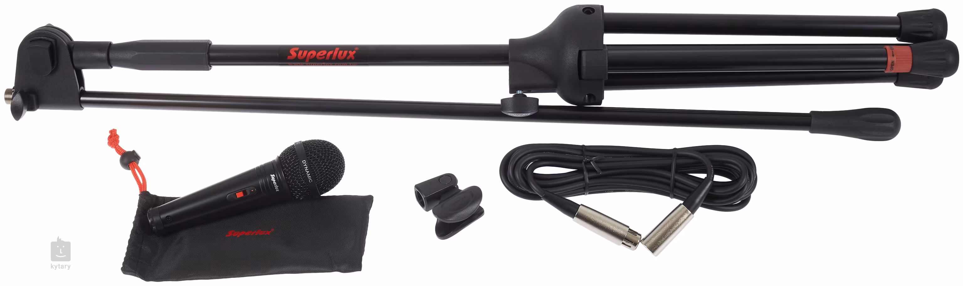 MSKA von Superlux ist ein komplettes Vokalset. Im Paket finden Sie ein ECO-A Mikrofon, ein hochwertiges MS108E Mikrofonstativ, eine Mikrofonklammer, ein 6 m langes XLR-Kabel, eine Mikrofontasche und einen Koffer für all diese Geräte.