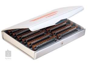 Das 1072 Set Folkmaster Wind Harmonica Set enthält zwölf diatonische Mundharmonikas in den Stimmungen C, G, A, D, E, F, Bb, B, F#, Eb, Ab und Db. Das Set wird in einem Kunststoffkoffer geliefert.