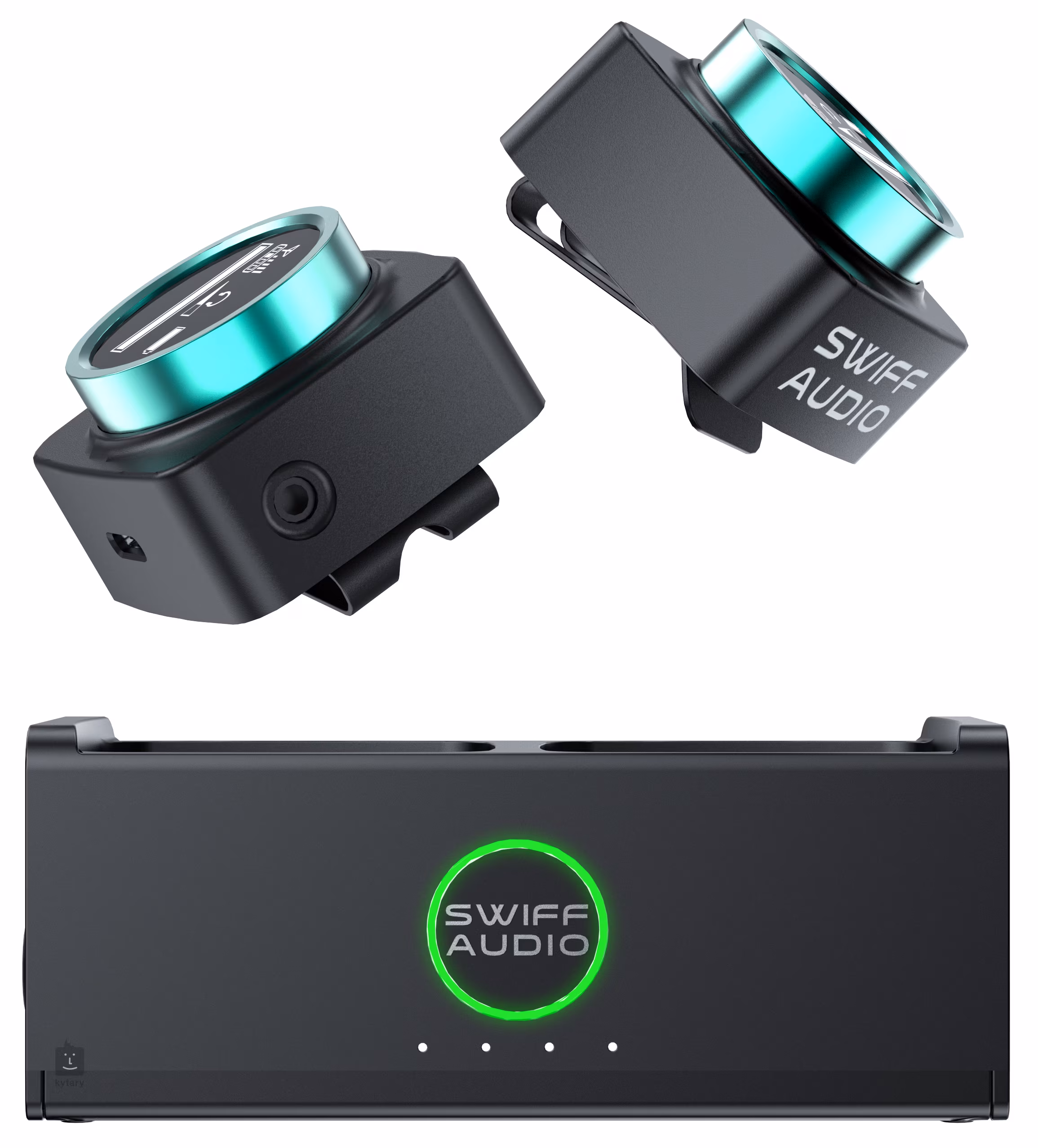 Das Swiff Audio WX-510 ist ein kompaktes drahtloses In-Ear-Monitoring-System. Das Set besteht aus einem Handempfänger mit Kopfhörerausgang und einem Sender, der auch als Ladestation für zwei Empfänger fungiert (der drahtlose Empfänger WX510R kann separat erworben werden). Dank des internen 8400-mAh-Akkus mit hoher Kapazität kann der Sender bis zu 20 Stunden lang betrieben werden, der Empfänger etwa 6 Stunden.