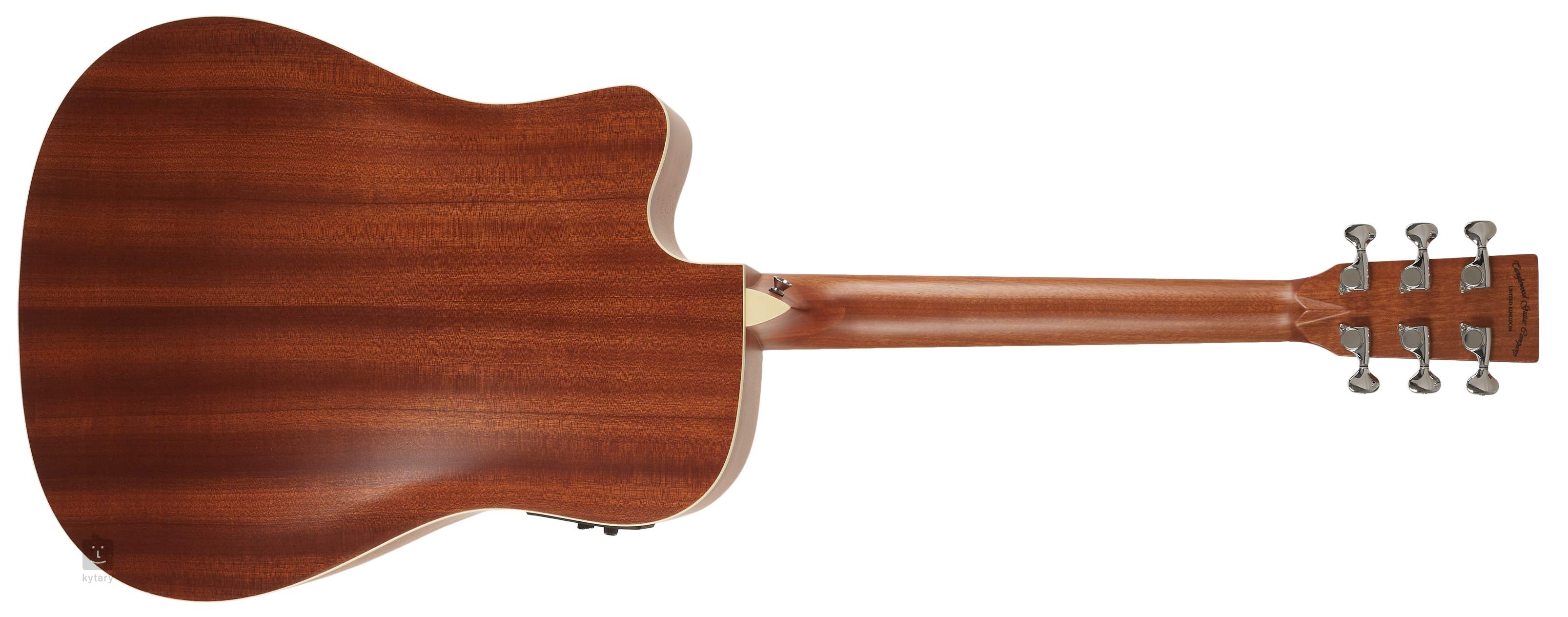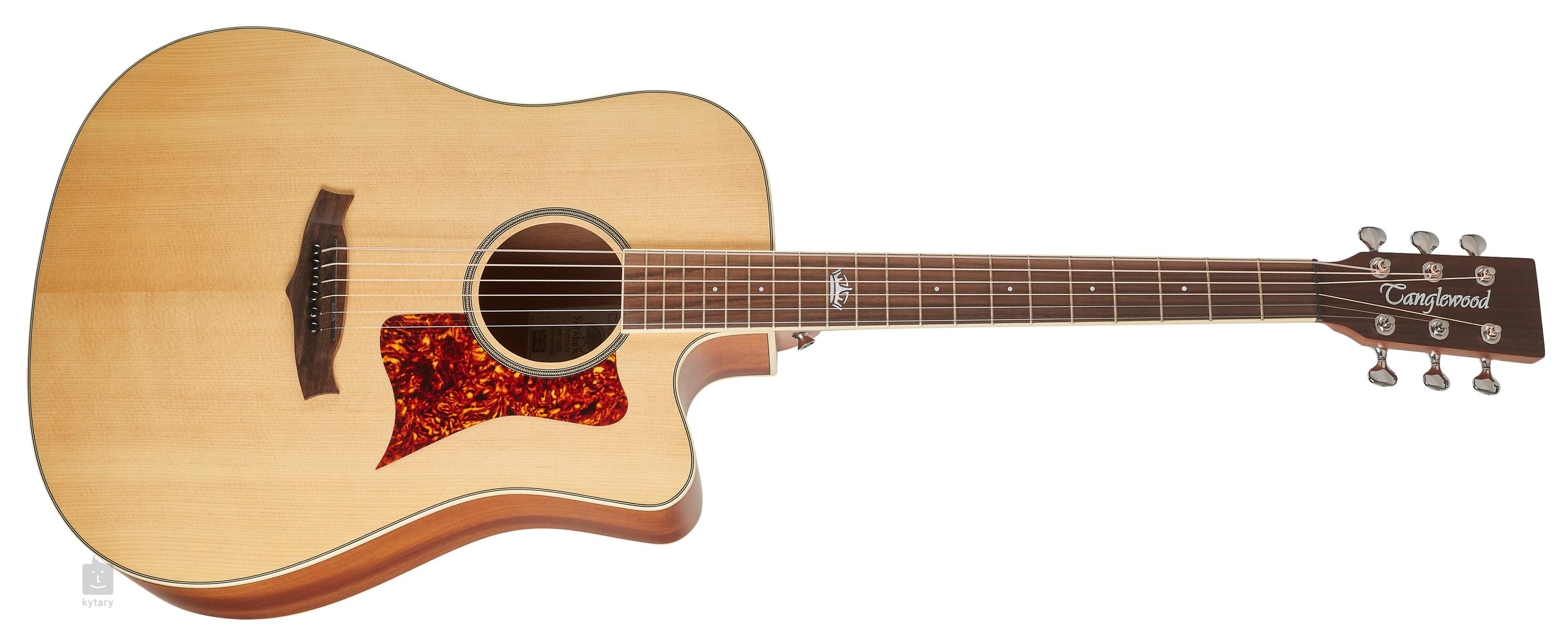 Die Tanglewood TSP 15 CE aus der Premier Serie ist eine elektroakustische Gitarre mit einem klassischen Western Dreadnought Korpus. Die Vorderseite der Gitarre ist aus einem handverlesenen Stück Sitka-Fichte gefertigt, das durch geschichtetes Mahagoni auf Boden und Zargen ergänzt wird. Auf den ebenfalls aus Mahagoni gefertigten Hals ist ein modernes Composite-Griffbrett mit 20 Bünden geleimt. Die Orientierung auf der Oberfläche des Griffbretts wird durch Perlmutt-Positionspunkte (MOP) und eine markante Perlmutt-Einlage am zwölften Bund erleichtert.