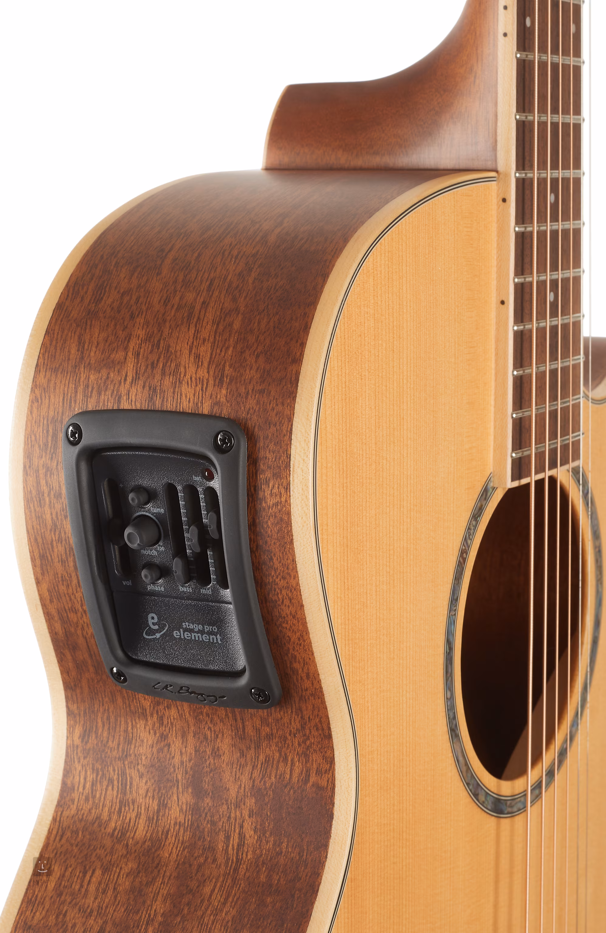 Die Tanglewood Winterleaf TW4CENA ist eine elektroakustische Gitarre des Typs "Super Folk", d.h. ein Instrument mit einem schmaleren und flacheren Korpus als die Dreadnought. Die Vorderseite der Gitarre ist aus massivem Zedernholz gefertigt, während Boden und Zargen aus laminiertem Mahagoni bestehen. Der Hals aus Nato-Holz, dem so genannten "Eastern Mahogany", ist mit einem Griffbrett aus einem modernen Verbundwerkstoff in Ebenholzdekor verleimt, das mit zwanzig Bünden bestückt ist. Eine praktische untere Korpusaussparung erleichtert das Spielen in den höheren Lagen des Griffbretts.