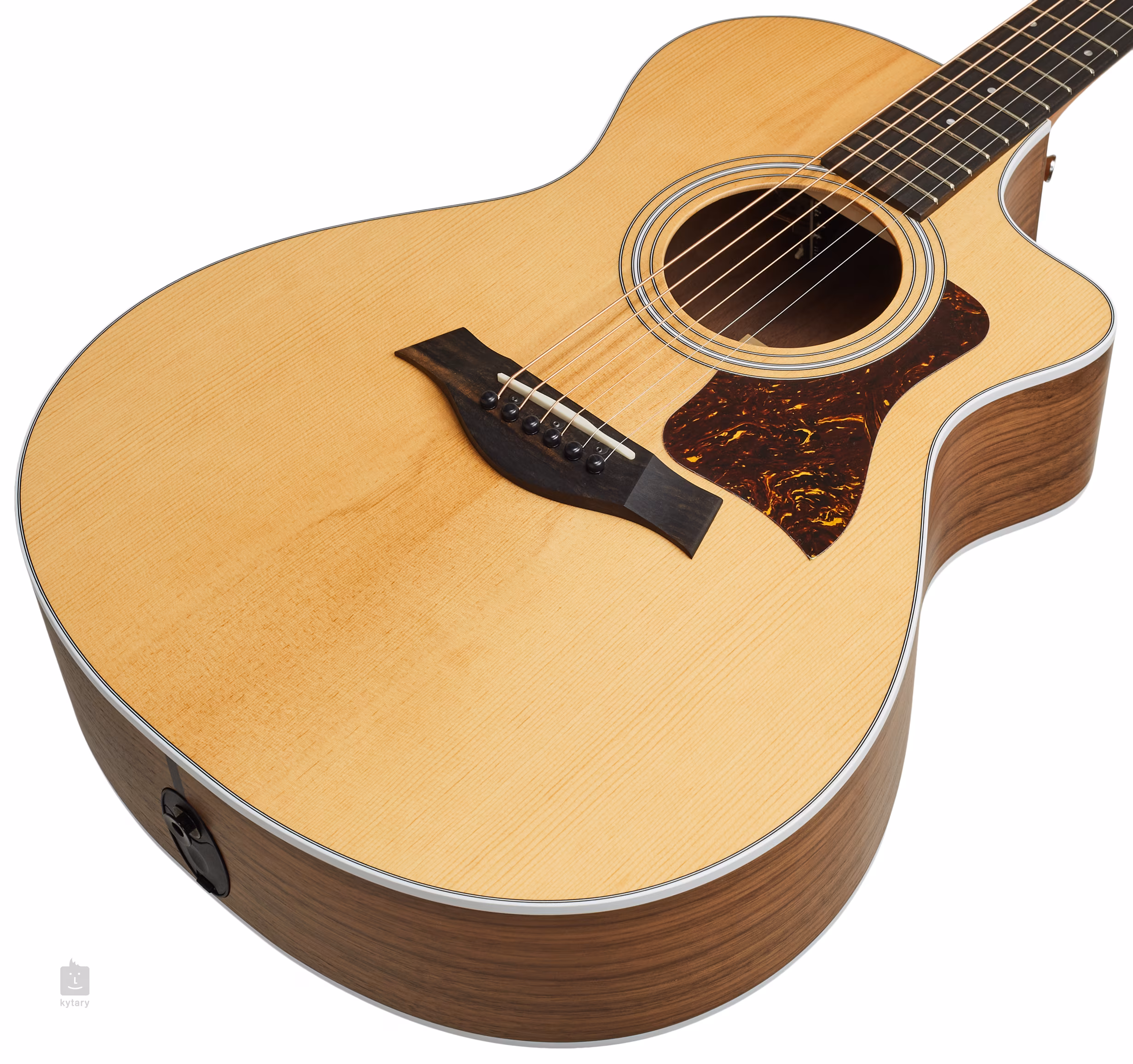 Die Stimmstabilität wird durch die NuBone Zero-Fret-Saitenbefestigung in der Ebenholz-Kopfplatte und die verchromte Taylor-Druckgussmechanik gewährleistet. Das stilvolle Aussehen des Instruments wird durch traditionelle Elemente in Form eines Schlagbretts aus Schildpatt-Imitat, einer hellen Randeinfassung, einer Rosette aus schwarzen und weißen Ringen und einem mit dem Taylor-Logo verzierten Ebenholzfurnier auf der Kopfplatte unterstrichen.