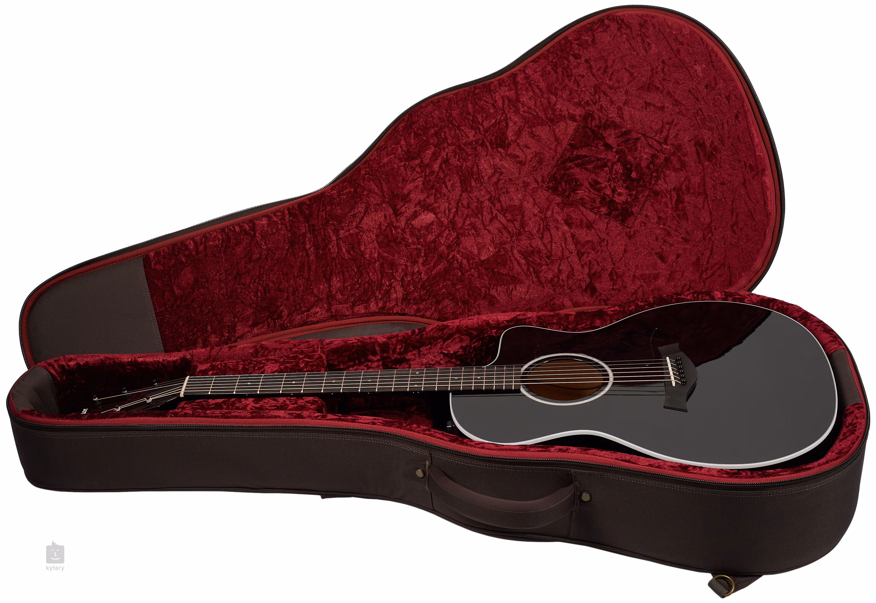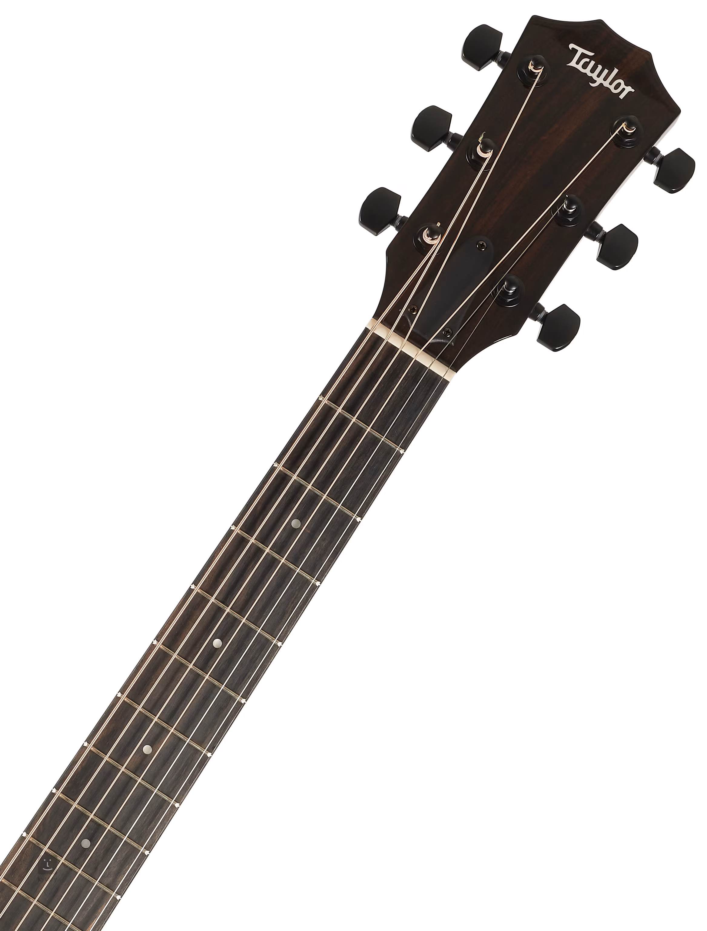 Der Ahornhals ist mit einem Ebenholzgriffbrett mit zwanzig Bünden verleimt. Ein dezent abgerundeter unterer Korpusausschnitt (Venetian Cutaway) erleichtert den Anschlag in den höheren Lagen des Griffbretts. Die Stimmstabilität wird durch die NuBone Nullbund-Saitenbefestigung in der Ebenholzkopfplatte und die Taylor Satin Black Mechanik gewährleistet. Der stilvolle Look des Instruments wird durch ein glänzend schwarzes Finish von Korpus und Hals sowie durch traditionelle Elemente in Form eines schwarzen Schlagbretts, eines weißen Korpusbindings und eines Ebenholzfurniers auf der mit dem Taylor-Logo verzierten Kopfplatte akzentuiert.