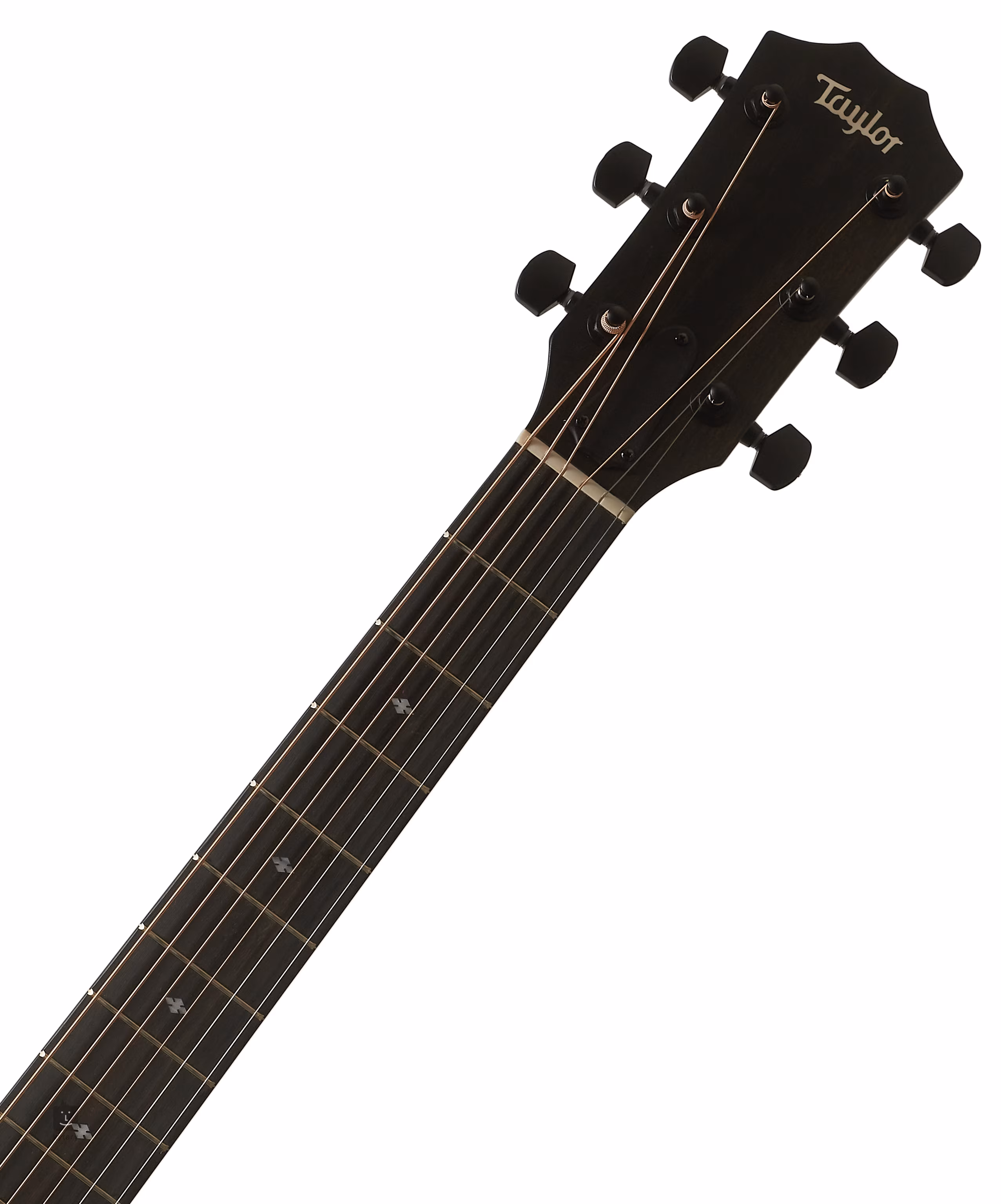 Die Vorderseite der Gitarre ist aus massiver Lutz-Fichte gefertigt, Boden und Zargen sind aus laminiertem Bergahorn. Auf den Ahornhals ist ein Ebenholzgriffbrett mit zwanzig Bünden geleimt. Positionsmarkierungen aus Perlmuttimitat in Form von kleinen Rauten erleichtern die Orientierung auf der Griffbrettoberfläche. Die Stimmstabilität wird durch die Befestigung der Saiten in schwarzen, druckgegossenen Taylor-Mechaniken gewährleistet. Die schöne Verarbeitung wird durch den Kontrast von glänzender Trans Blue Decke und schwarzem Boden und Zargen unterstrichen. Hinzu kommen traditionelle Elemente in Form eines weißen Korpusbindings, ergänzt durch ein schwarz-weißes Schlagbrett, eine Rosette aus Perlmuttimitat und ein schwarzes Schlagbrett.