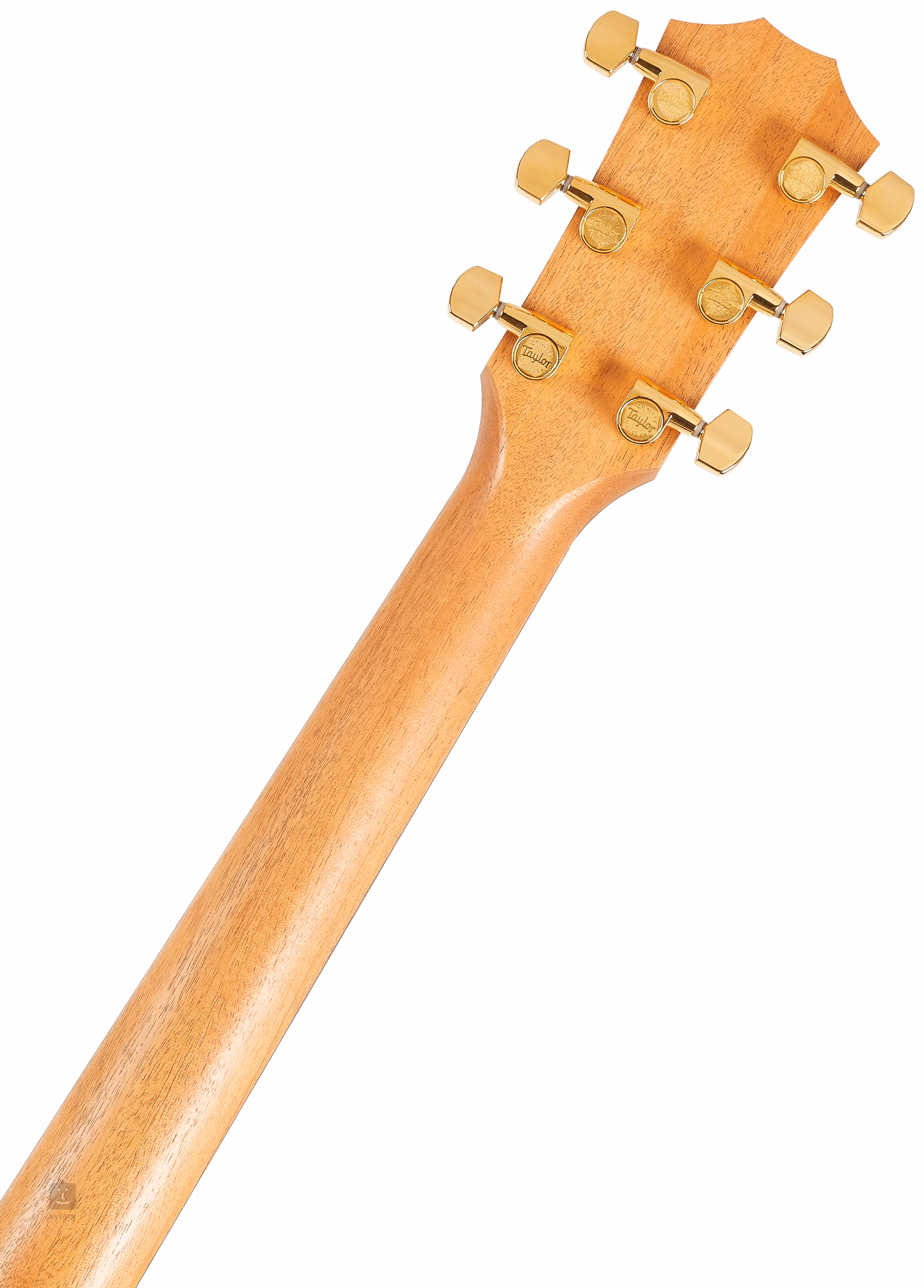 Der Mahagoni-Hals ist mit einem Ebenholz-Griffbrett mit zwanzig Bünden verleimt. Ein dezent abgerundeter unterer Korpusausschnitt (Venetian Cutaway) erleichtert das Anschlagen in den höheren Lagen des Griffbretts. Die Stimmstabilität wird durch die NuBone-Saitenbefestigung über dem Nullbund in der Ebenholzkopfplatte und die Taylor-Goldlackierung gewährleistet. Der stilvolle Look des Instruments wird durch traditionelle Elemente in Form eines schwarzen Schlagbretts, einer Perlmuttrosette und des Firmenlogos auf der Kopfplatte unterstrichen.