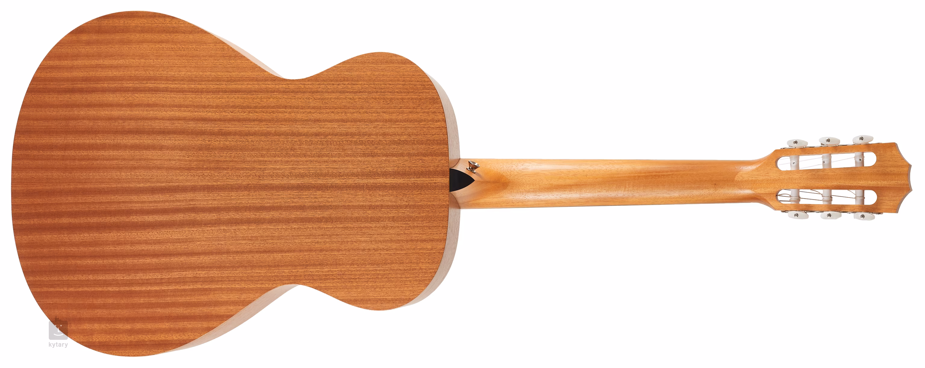 Die klassischen Gitarren dieser Serie haben eine massive Decke aus Lutz-Fichte und einen Korpus aus laminiertem Sapele. Auf den ersten Blick fällt die Armlehne ins Auge, ein abgeschrägter Bereich an der Oberseite des Gehäuses, wo sie den Arm berührt. Dieses Designmerkmal macht das Spielen sehr komfortabel und ist nur bei teureren Modellen serienmäßig vorhanden.