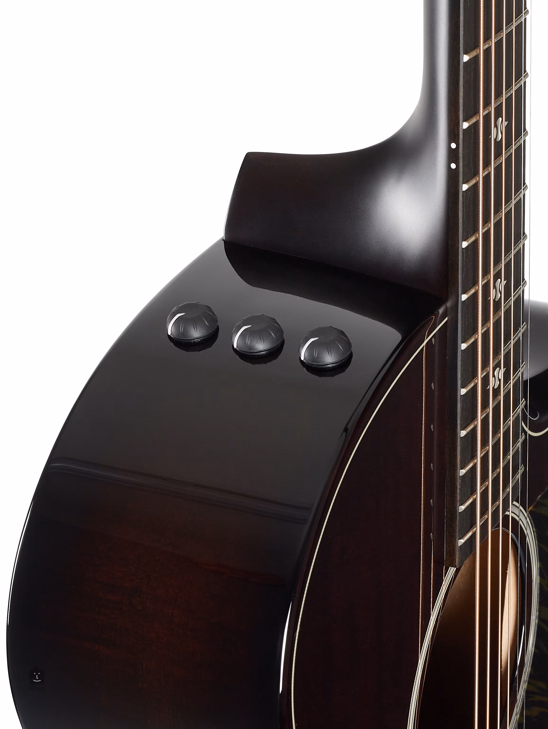 Die Gitarre ist mit hochwertiger Firmenelektronik ausgestattet. Das Taylor Expression System 2 verwendet drei speziell entwickelte und individuell kalibrierte Piezo-Tonabnehmer, die sich hinter dem Griffbrett befinden. Anders als herkömmliche Tonabnehmer nehmen sie nicht die Auf- und Abwärtsbewegung des Brettes wahr, sondern die natürliche Hin- und Herschwingung des Griffbretts. Dadurch wird der Klang des Instruments viel natürlicher, farbiger und angenehmer und reagiert besser auf die Dynamik Ihres Spiels. Gleichzeitig ist das Signal dank des neuen Vorverstärkers 25 % stärker. Natürlich gibt es keine Rückkopplungen mehr und Sie können Lautstärke, Bässe und Höhen einstellen.