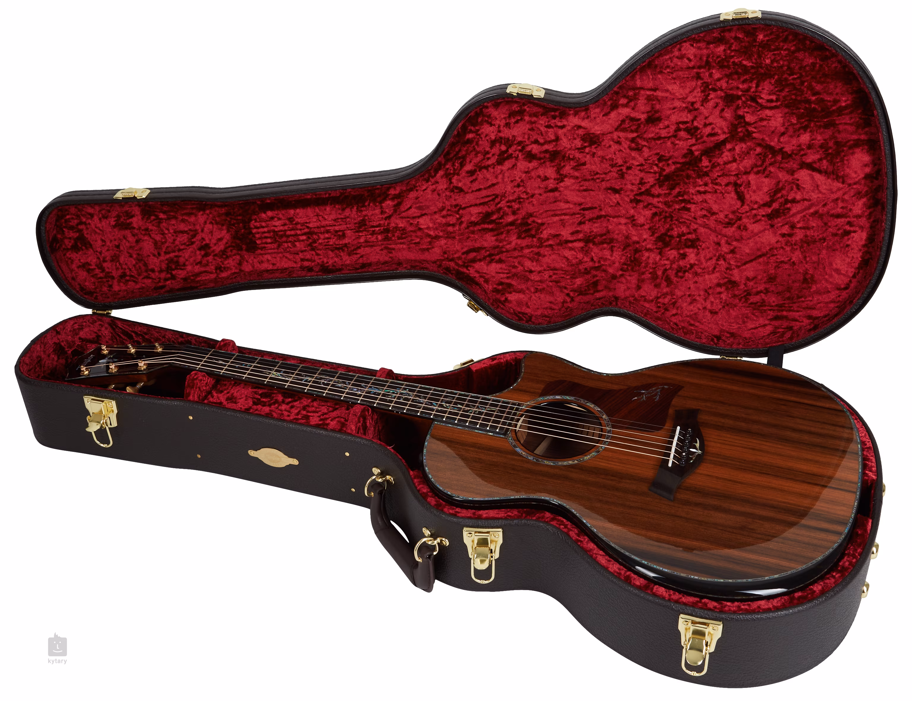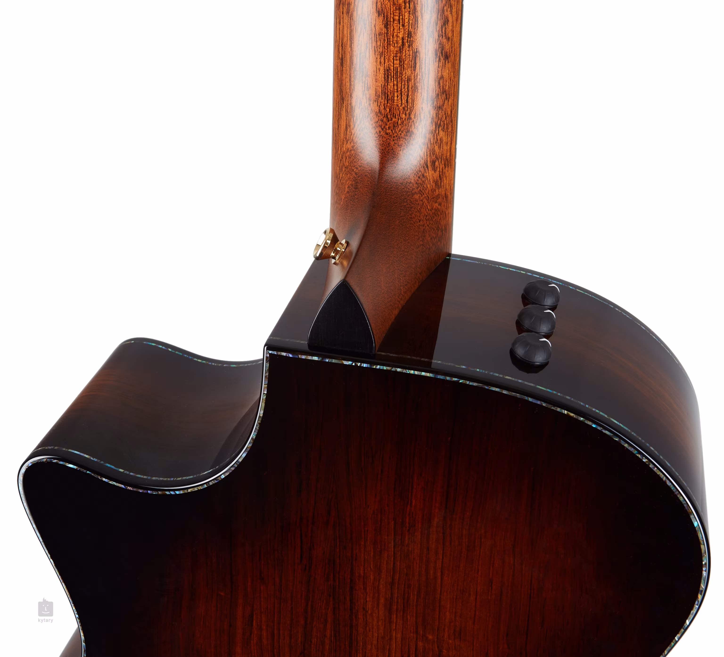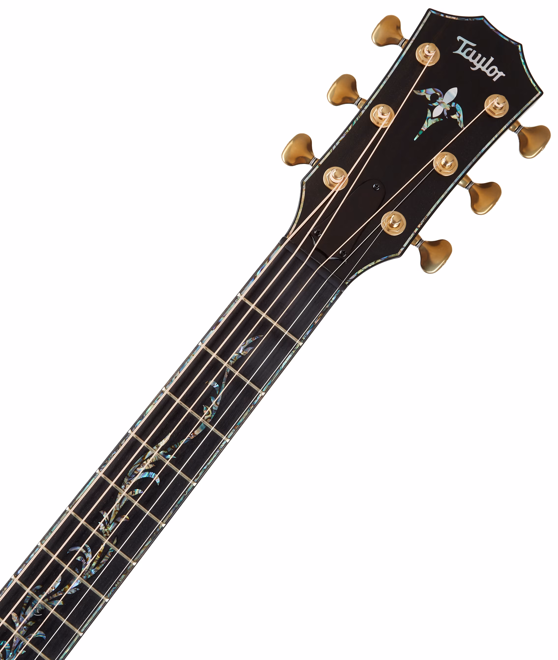 Die abgeschrägte Ebenholzarmlehne, der geformte untere Korpusausschnitt und die patentierte V-Class Verrippung, die die Leistung der Gitarre in dreierlei Hinsicht verbessert - sie erhöht die Lautstärke, verlängert das Sustain und verbessert die Intonation - sorgen für maximalen Spielspaß. Auf den Mahagoni-Hals ist ein Ebenholz-Griffbrett geklebt, das mit Perlmutt-Einlagen in Form von Weinblättern verziert ist (Shell, Mother-of-Pearl). Die Stimmstabilität wird durch Gotoh 510 Goldmechaniken mit einem Übersetzungsverhältnis von 21:1 gewährleistet. Das luxuriöse Erscheinungsbild der Gitarre wird durch dekorative Elemente in Form von Ebenholz-Einfassungen an Korpus, Griffbrett und Kopfplatte unterstrichen, ergänzt durch Perlmutt-Inlays, Perlmutt-Rosetten (Paua, Shell), Perlmutt-Inlays auf der Kopfplatte, Palisanderfurnier auf der Kopfplatte, Taylor-Firmenlogo aus Perlmutt (Mother of Pearl) und Shaded Edgeburst-Lackierung auf Boden und Zargen.