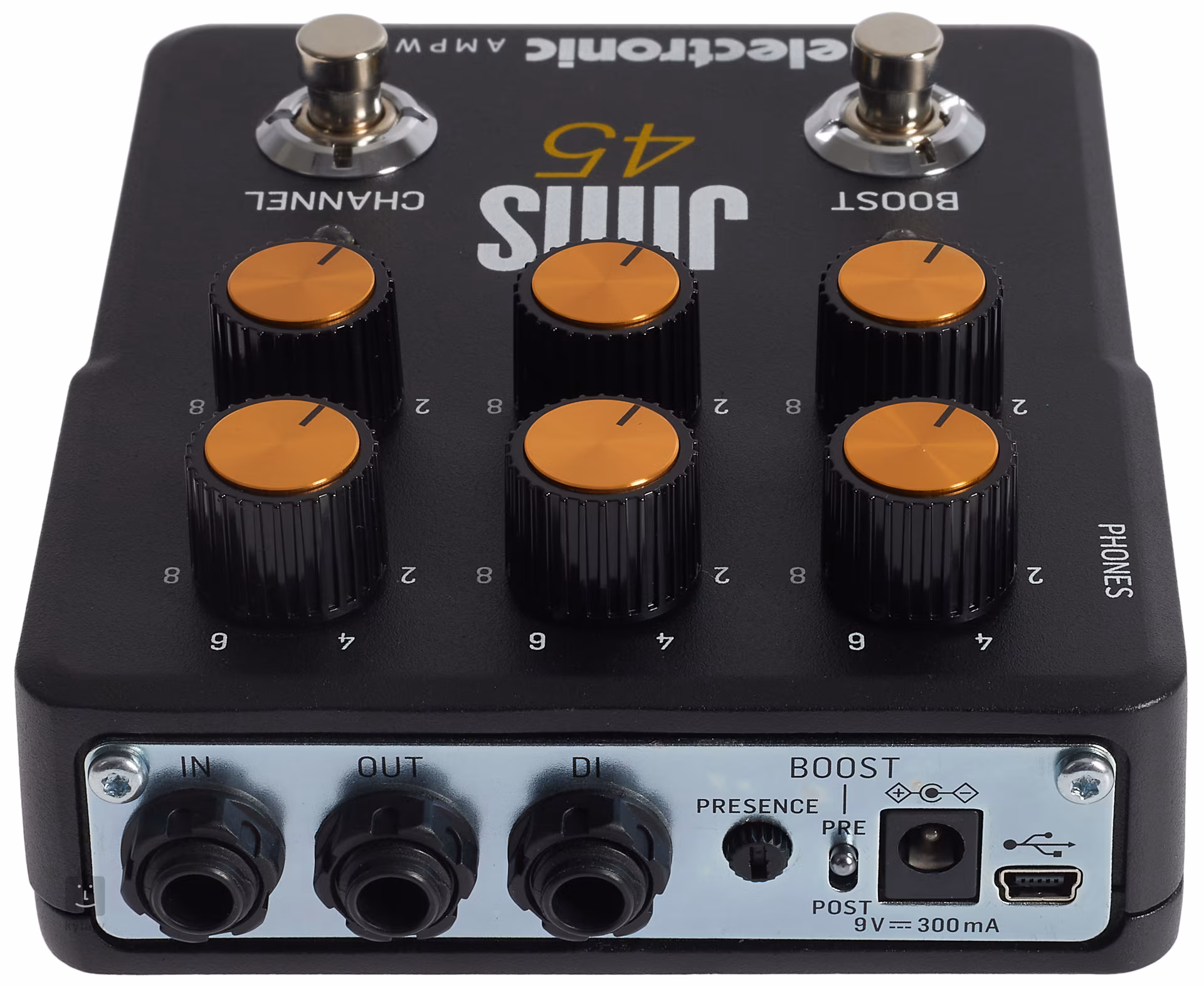 Drücke beide Fußschalter, um den Mod (Dual Channel) in den Bypass-Modus zu schalten, wobei der Kanalschalter als An/Aus-Pedal für den aktuell gewählten Kanal fungiert. Der USB-Anschluss wird nur für Firmware-Updates verwendet. Der JIMS 45 Preamp ist als gepufferter Bypass verdrahtet. Für die Stromversorgung wird ein 9V-Adapter benötigt.