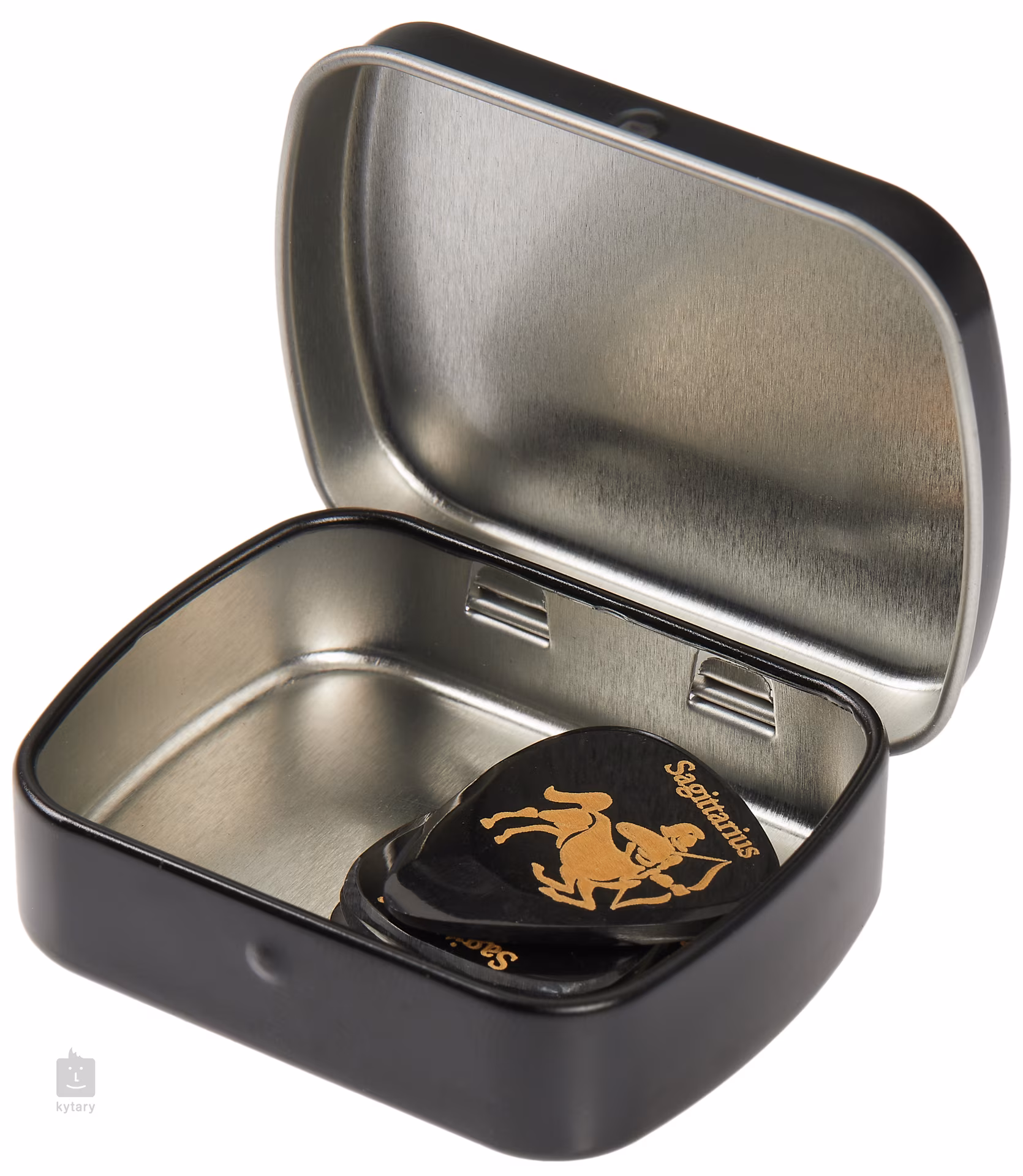 Set aus vier Plektren mit dem Motiv des Sternzeichens Schütze in einer praktischen Blechdose.