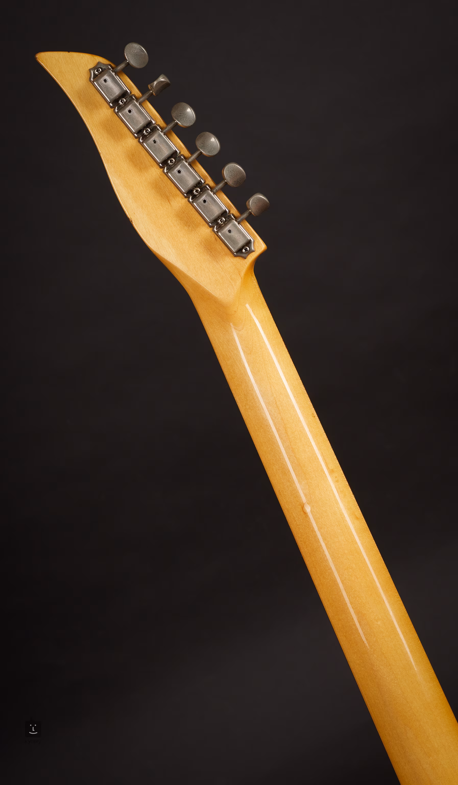 Die japanische Tokai Blazing Fire-Gitarre aus den 1990er Jahren ist der Nachfolger des ursprünglichen Talbo-Modells, das einen Korpus aus Aluminiumlegierung hatte. Diese seltene Neuauflage der Originalform hat einen Holzkorpus, der in Rotmetallic lackiert ist.
