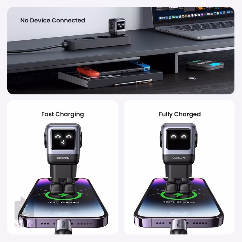 Auch ein Ladegerät kann Stil haben! Verwandeln Sie das Gewöhnliche in etwas Außergewöhnliches und holen Sie sich einen Lade-Roboter, der Sie mit einem Emoji auf dem monochromen Display immer über Ihren Ladestatus informiert.
